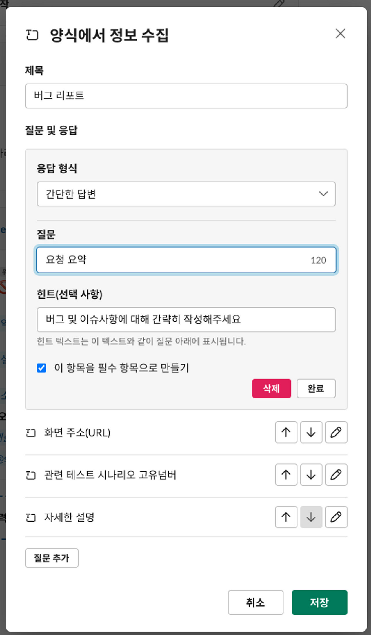새로 생성하고자 하는 워크플로의 제목, 질문과 응답을 등록합니다. 이 경우에는 테스트 수행 중 발견한 버그리포트를 목적으로 하기 때문에, 1) 요청 요약, 2) 화면주소(URL), 3) 관련 테스트 시나리오 고유넘버, 4) 자세한 설명 이 4가지를 설정했습니다. 각 질문은 질문의 문장과 질문에 대한 설명(힌트), 필수 입력 항목 여부로 구성할 수 있습니다. 테스트 시나리오와 관련 없는 이상 동작 또한 리포트 되어야 하기 때문에 '관련 테스트 시나리오 고유넘버'는 필수 항목에서 제외했으며, 앱 테스트의 경우, 대부분의 경우 URL을 복사할 수 없기 때문에 마찬가지로 선택 항목으로 설정했습니다.