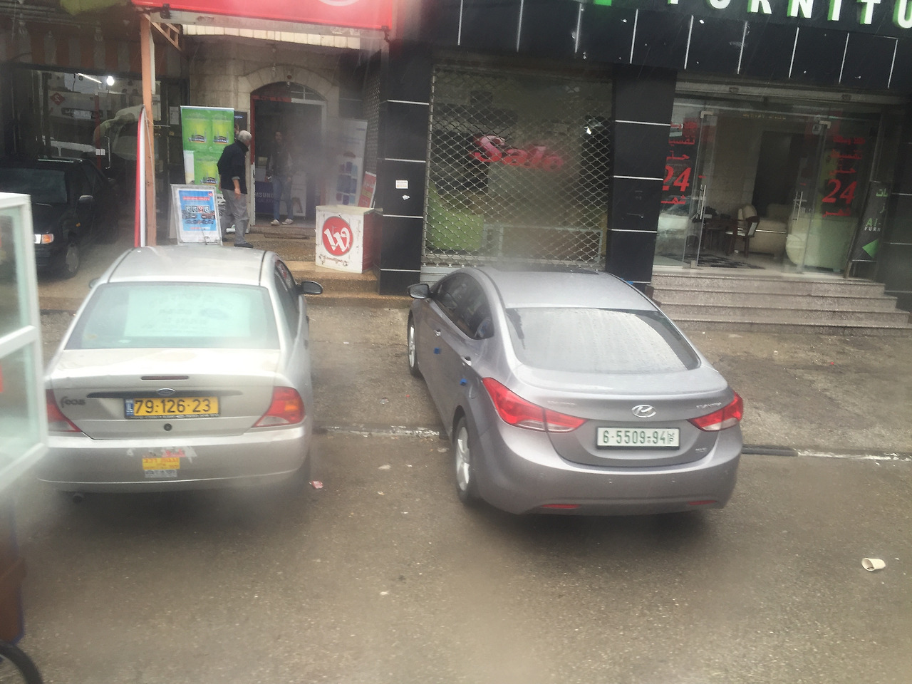 왼쪽은 팔레스타인 구역에서 일반 이스라엘 지역으로 통행을 허가받은 차고, 오른쪽은 허가를 받지 않아서 나갈 수 없는 차다. 글 초반에 설명했던 바와 같이 팔레스타인 구역과 유대인 구역을 나누는 방법 중 하나다.