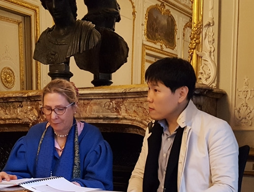 중 : 저는 어떤 종이가 있는지 소개하는 역할을 하고, 최종 의사결정은 루브르 박물관 연구소장이 담당하세요. 아리안 드 라 샤펠(Ariane de la Chapelle) 연구소장이 두 개를 선택한 후 복원사에게 작업을 해보라고 넘겨주죠. 이때 한지가 선택이 된 거예요.