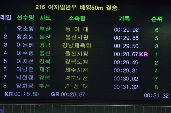 주 : 2010년 광저우 아시안 게임 국가대표로 선발되었고 같은 해 국내 전국체전에서 최우수선수상을 받았습니다. 다음 해 2011년 세계수영선수권대회에도 국가대표로 선발되었는데 부상으로 출전은 못했어요.