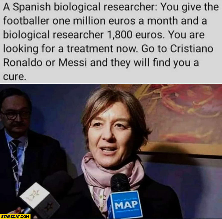 축구 선수에게는 한 달에 백만 유로를 주면서 생물학자에게는 1,800유로를 주고 있습니다. 현재 다들 치료제를 찾고 있는데요. 크리스티아노 호날두나 메시에게 가서 찾아달라고 하세요.