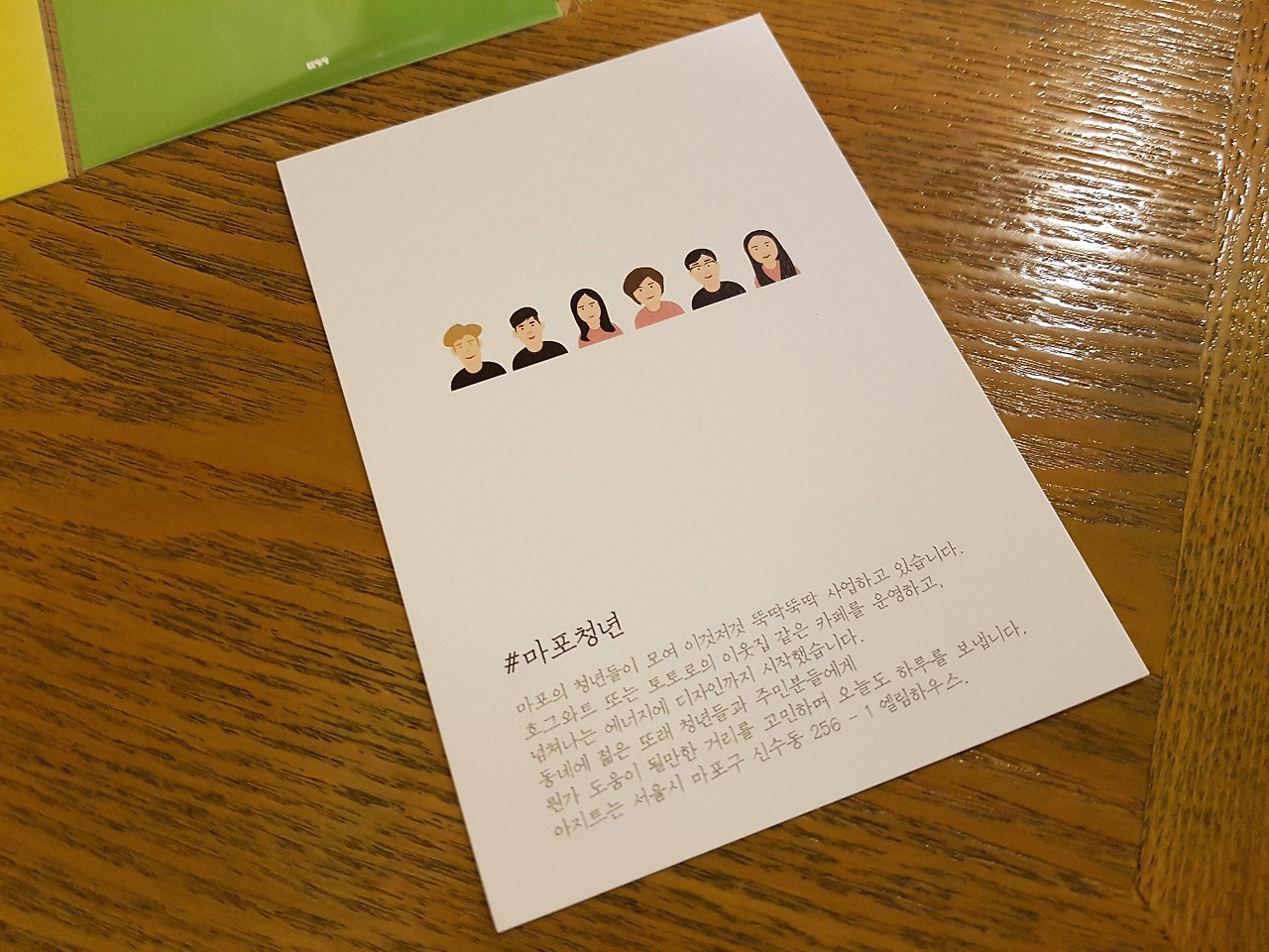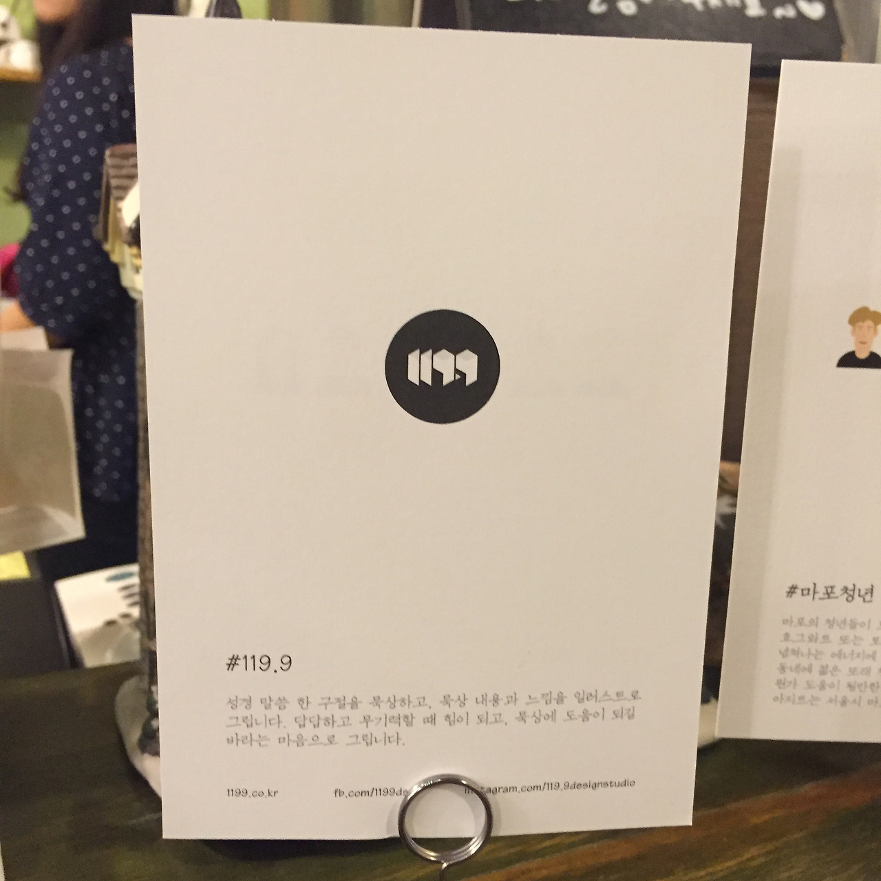 엽서와 더불어 119.9 & 마포청년 소개지와 브랜드 로고 및 디자인 스티커가 함께 들어가 있다.
