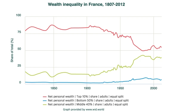 먼저 소득(Income) 불평등이다. 위 그래프는 프랑스 전체 국가의 소득(GDP)에서 상위 10%, 중위 40%, 하위 50%가 차지하는 비율을 추세적으로 나타낸 그래프다. 각각 빨간색, 초록색, 파란색 선으로 나타난다.