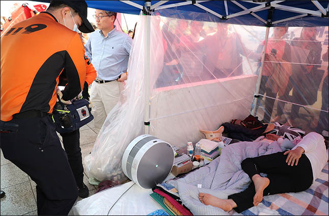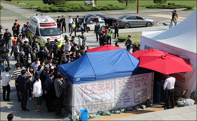 단식 시작 몇 시간 뒤 현장에 갔다. 기자들이 열댓명에서 스무명 정도 모여있었다. 원내대표는 카메라 세례를 받으며 웃고 있었다. 표정엔 여유가 흘렀다. 가까이 가서 괜찮겠냐고 말을 걸었다. 원내대표는 웃으며 "해야 하는 일이니 버텨봐야죠"라고 했다.