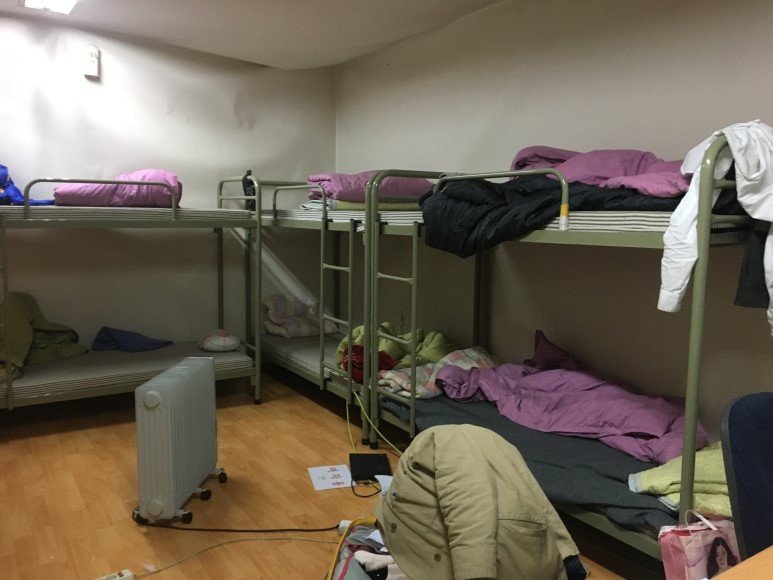 문을 열자 보인 2층 침대들. 바닥에는 온갖 짐이 어지러이 놓여져 있었다. 정신 없이 자고 있던 수습 한 명은 문소리가 들리자 부스스 눈을 떴다. 나는 먼저 "안녕하세요" 라고 말을 걸었지만, 그 수습은 세상 죽어가는 목소리로 "네" 라는 말과 함께 이불을 그대로 뒤집어 써버렸다.