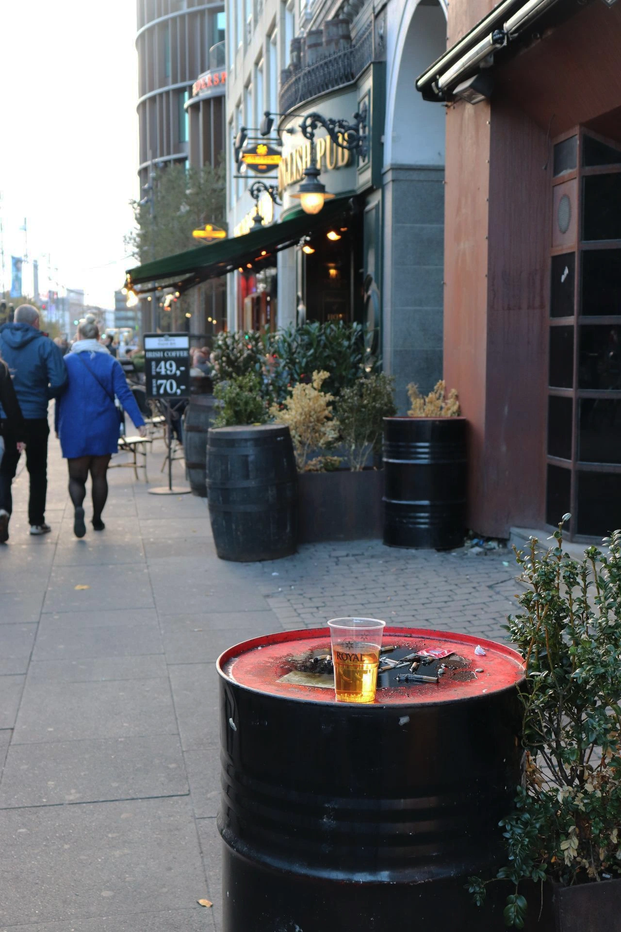 드럼통 위에 쏟아진 생맥주와 그 물기에 처박힌 담배 꽁초.
