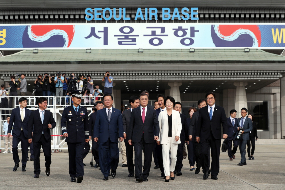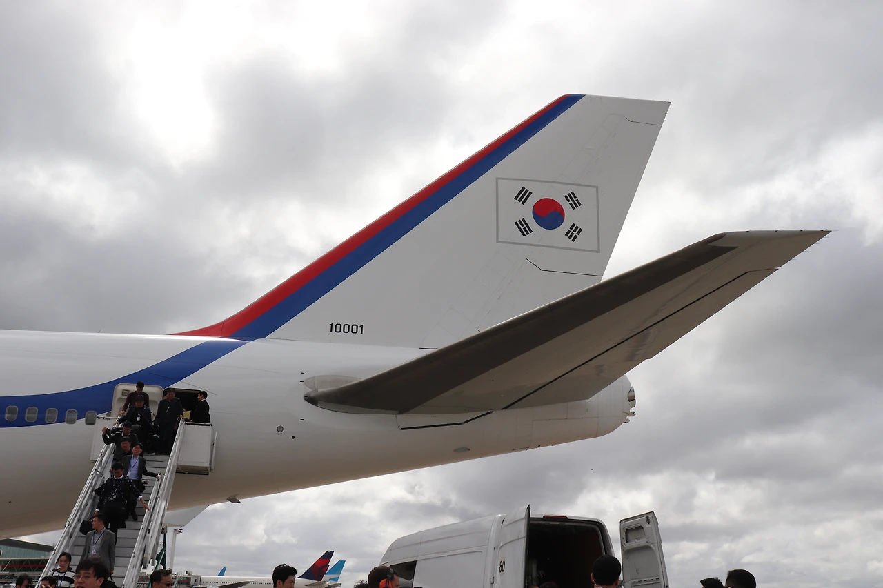 공군 1호기, 즉 대통령 전용기를 타봤다. 해외 순방에 동행하는 기자들은 공군 1호기 1층 뒷자석의 이코노미석을 타고 함께 이동한다. 대한항공 승무원과 현직 공군들이 함께 항공 서비스를 제공한다. 공군 1호기에는 영어 안내판이 없고, 이륙할 때도 "승객여러분"이 아니라 "대통령님, 여사님, 공군 1호기는..." 으로 안내를 시작한다.