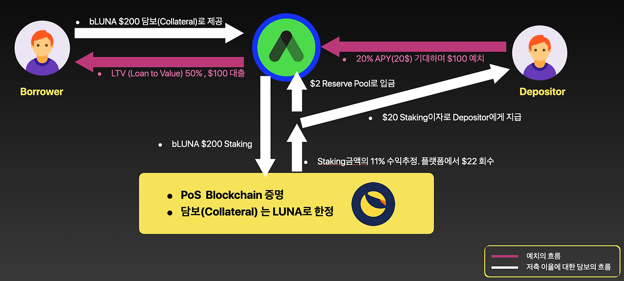 결론은 LTV와 TVL(Loan to Value & Total Value Lock)에 있다. 유저가 예치(Staking)하고 빌리고 (Borrowing)을 할 때 앵커 프로토콜은 Bonding LUNA를 지분 증명으로 쓰고 수익을 추정하고 예금을 예치한 사람들에게 돌려주는 로직이다.