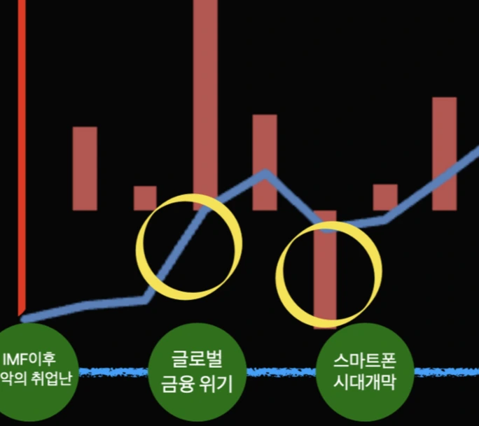 직장인 주식 스터디 모임에서 나의 인생 이야기에서 거시적 시장 환경의 흐름과 대비한 설명을 위해 연봉의 추세선을 시간축과 연결해 수치없이 커리어패스를 설명한 적이 있다.