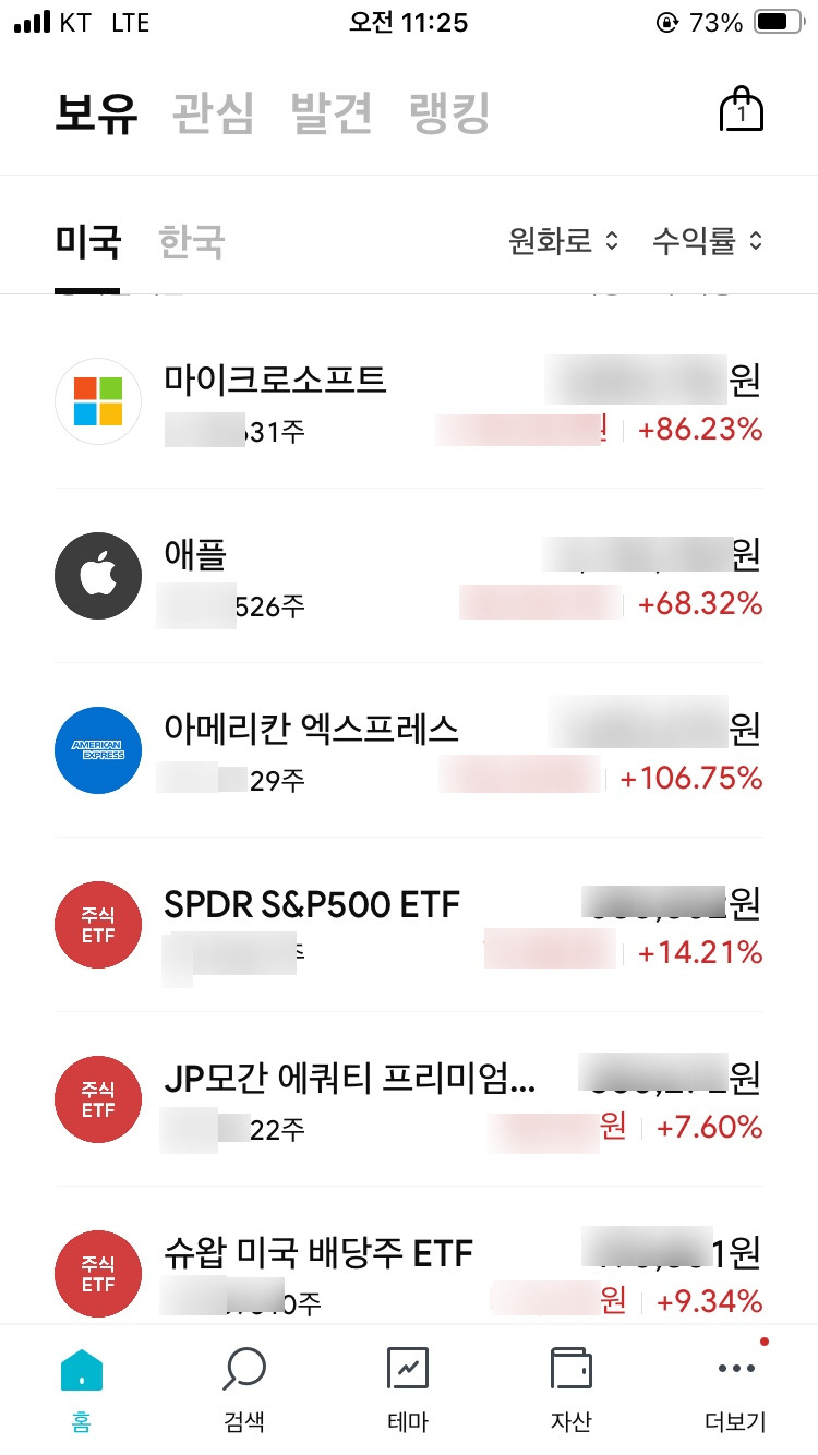지난 2년 반동안 OTC 소수점 구매계좌에 들어있는 배당주들의 보유수도 늘었고 수익률도 나쁘지 않습니다. 큰돈은 아니지만 꾸준히 루나 피해액 보상을 현금화하고 DCA (적립식 투자)를 하는 과정에서 여러 가지 큰 시장의 등락을 겪었지만 흔들리지 않고 조금씩 보상금을 적립해 나갔기 때문에 단기적인 수익에 매몰되지 않았습니다.