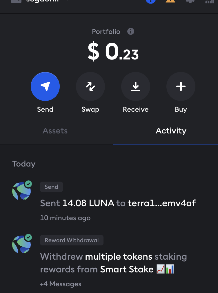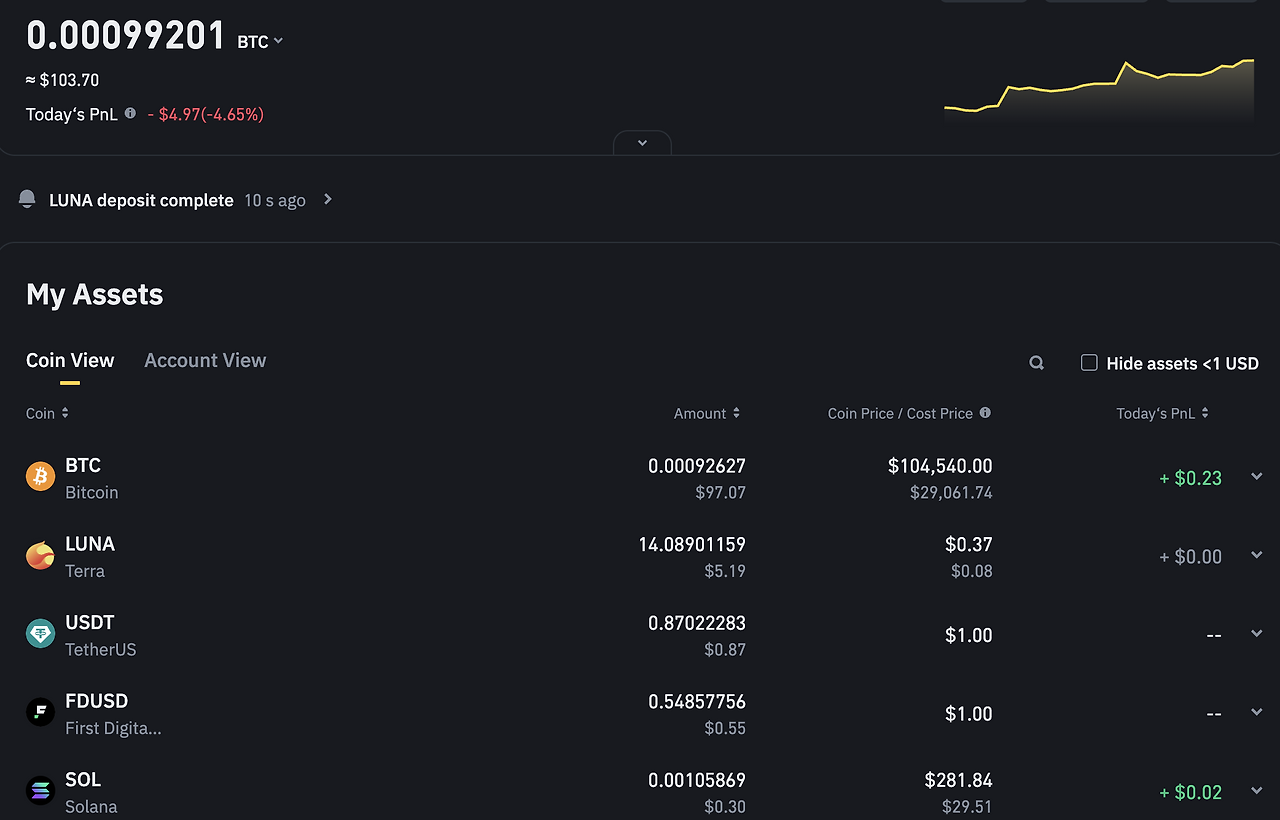 매달 재단에서 스마트컨트랙트로 자동으로 보상받는 LUNA2 코인과 기존에 가지고 있던 LUNC, USTC의 Staking 예치 이자가 나오면 바로 바이낸스로 보내서 비트코인을 꾸준히 구입했습니다. 비트코인 가치가 100달러가 넘으면 CEX로 보내서 현금화해서 미국 배당주 위주로 소수점 투자를 합니다.