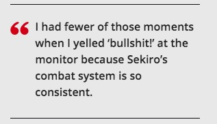 "세키로의 일관된 전투 시스템은 '말도 안 돼!!'라며 모니터 앞에서 소리를 지르는 일을 만드는 일은 거의 없다."