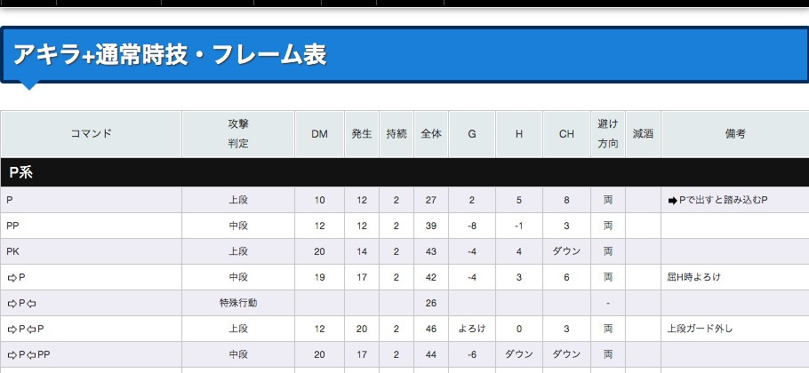 오른쪽 사진은 세계적인 대표적 대전 격투 게임 버쳐 파이터의 기술 프레임 표입니다. 앞서 언급한 프레임, 즉 게임 캐릭터의 공격과 방어 시 발동하는 프레임과 불리한 프레임을 파악하는 표입니다.