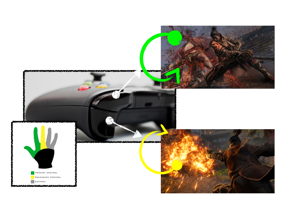 게임에서 플레이어의 입장에서 사용빈도가 높고 우선도가 높은 조작 'Primary Control'이라고 부르고 엄지와 검지 손가락에 할당하는 것이 보편화되어있습니다. 사용빈도가 잦지 않은 조작을 'Secondary Control'이라고 하며 주로 중지 손가락에 할당하는 것이 일반적입니다.