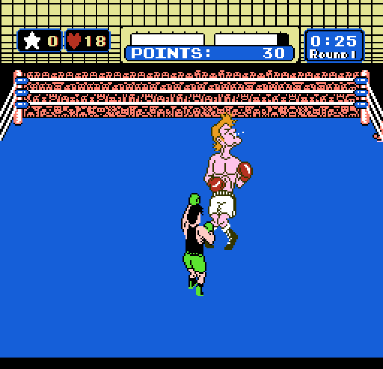 복싱이라는 긴장감 높은 스포츠 장르를 아케이드적 재미로 잘 풀어내 남녀노소 할 것 없는 공전의 히트를 기록한 닌텐도 Punch Out!! 화면입니다. 무엇이 보이시나요? 권투의 기본인 왼손 오른손 블로우 공격을 번갈아 하는 것이 눈에 띕니다.