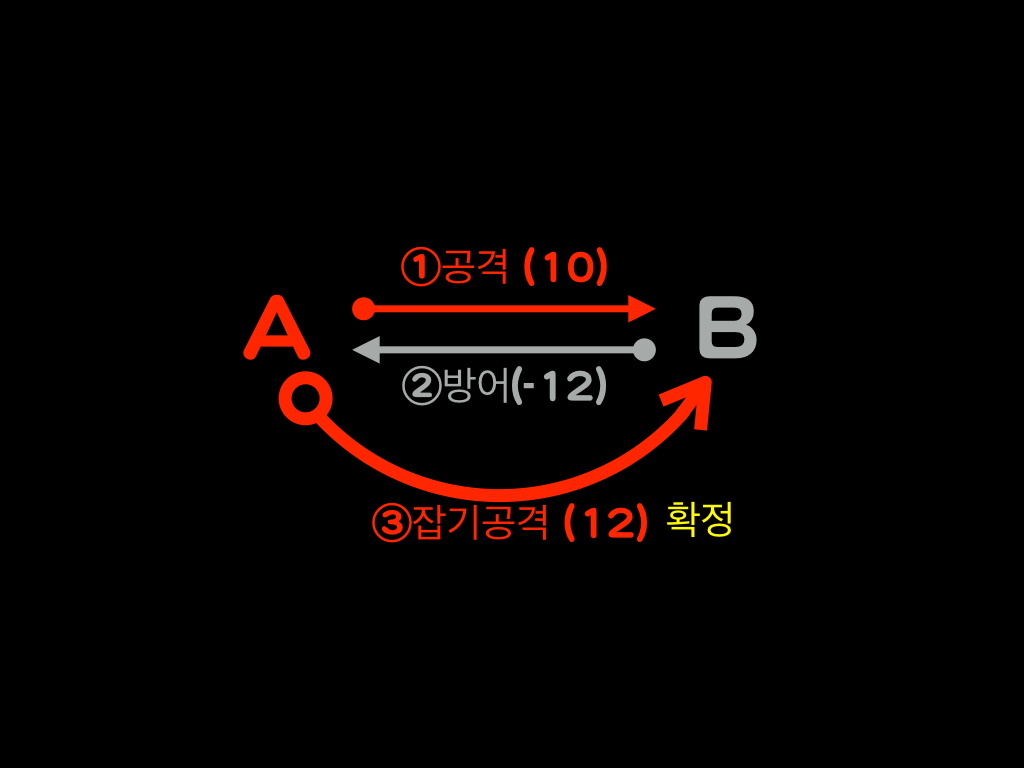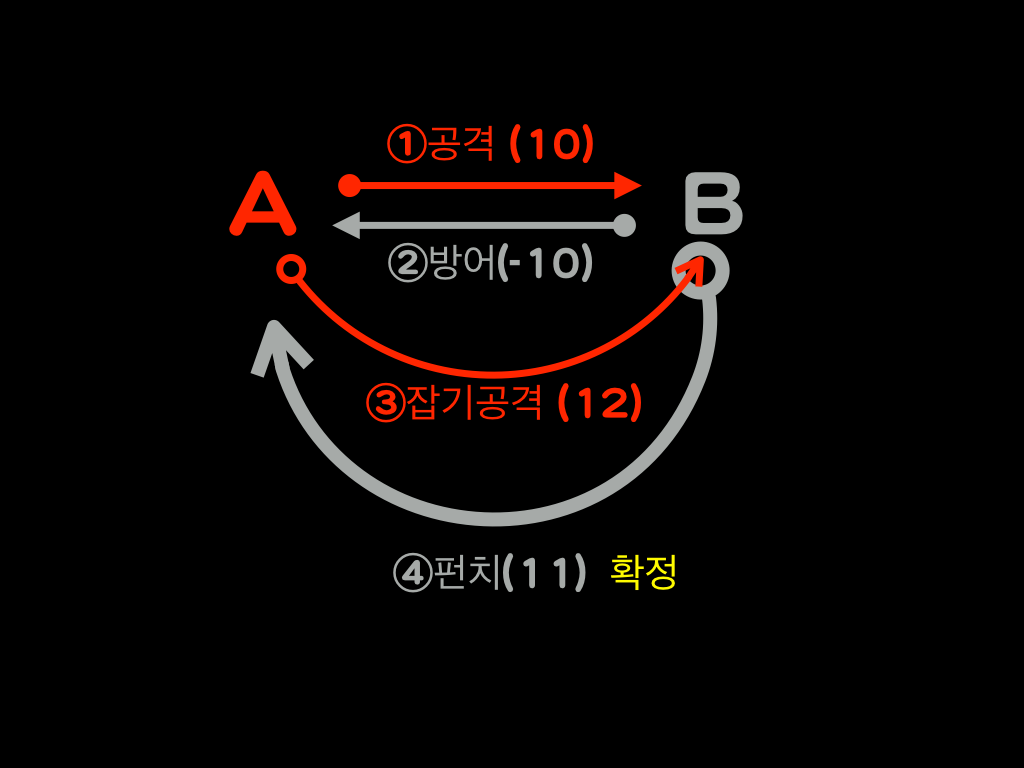 왼쪽 그림에서 A의 발동 프레임이 10 프레임인 기술을 상대인 B에게 사용했고, B는 방어를 하여 경직되어 12 프레임이 불리해진 상황이라면 A가 상대방을 잡는 12 프레임에 발동하는 잡기 공격을 쓰면 반드시 잡힙니다.
