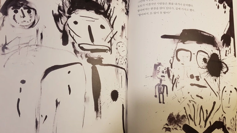 압권은 9번 말이 1등으로 들어오자 충격을 받은 할아버지와 주변 사람들의 모습을 검은 선과 먹물을 던져 표현한 장면이다. 결과에 대한 충격과 허탈함과 허망함이 거친 붓선과 먹물자국에 잘 드러나 있다.