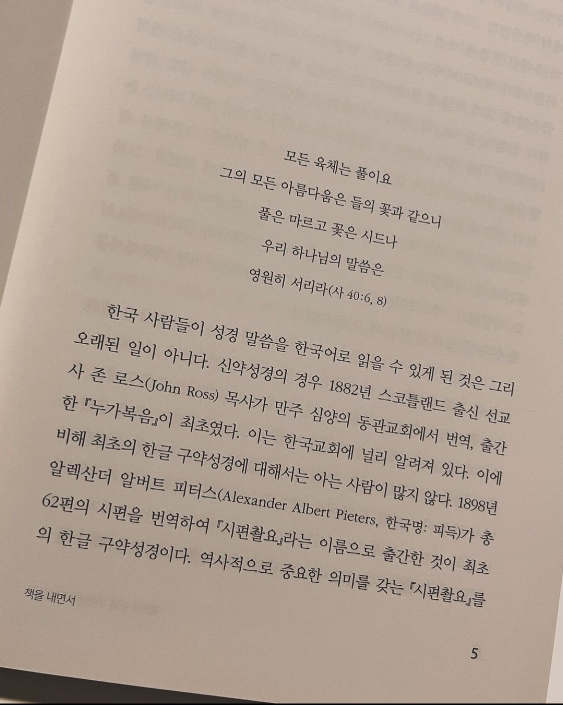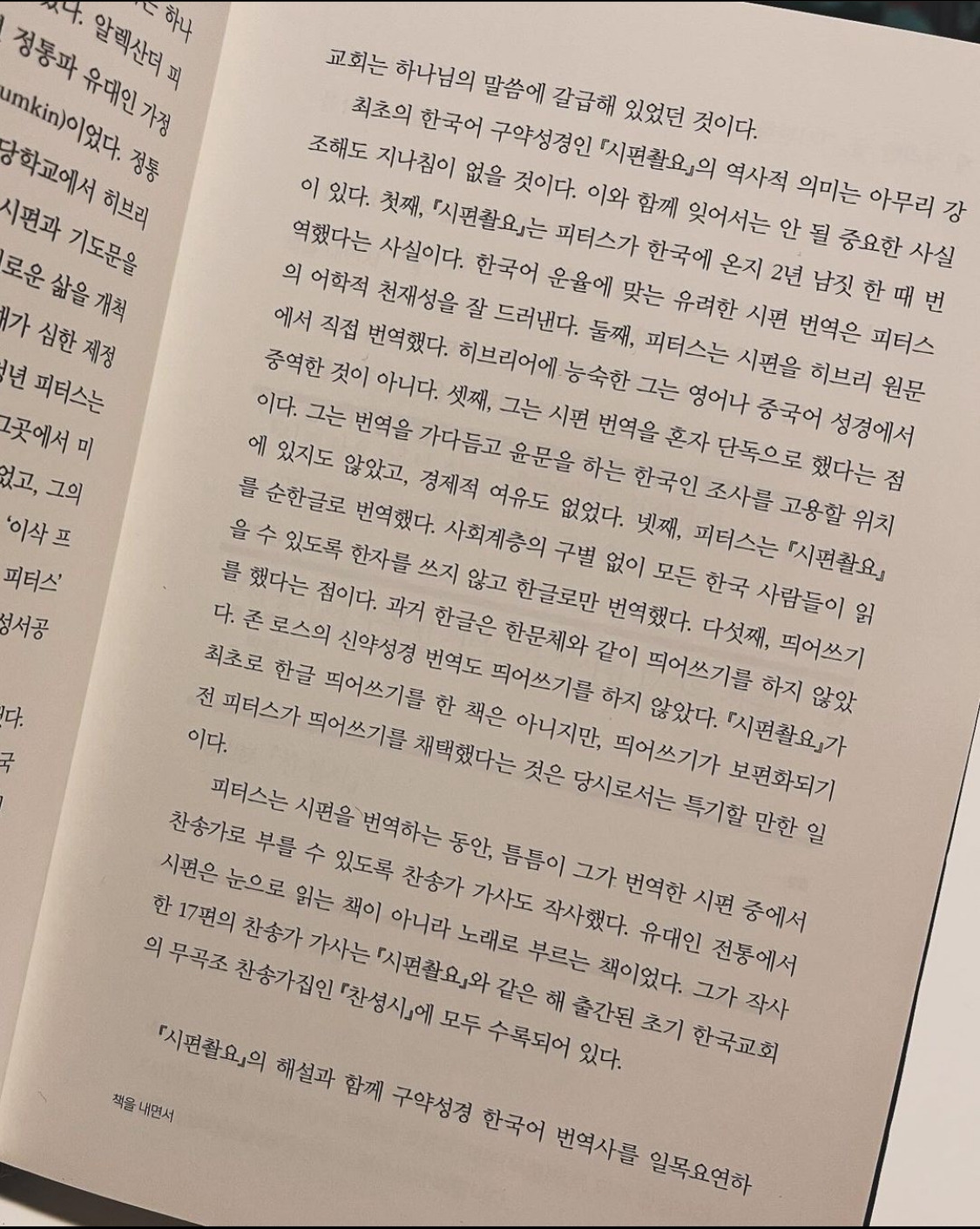 메마른 땅에 단비 같은 이러한 노력은 그가 한국에 온 지 2년 남짓 한국어에 능통하여 이를 번역하고 출간하게 되었다는 사실에 또 한 번 놀라게 되고 한국을 사랑하고 택하셔서 한글로 성경을 읽고 이해하게 됨을 감사하지 않을 수 없다.