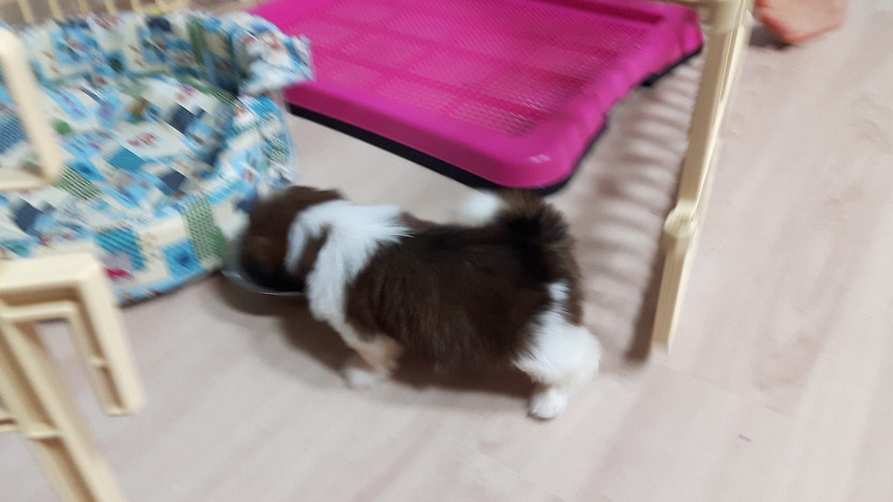 바닥을 닦고 거실 구석에 미리 준비해둔 플라스틱 울타리를 쳤다. 울타리 안에 배변판과 방석, 물그릇을 넣은 후 강아지를 집어넣었다.