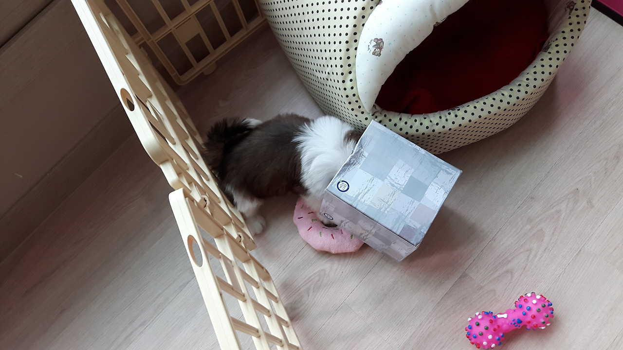 밖으로 나오고 싶은지 살랑이는 울타리를 잡고 일어서 낑낑댄다. 미리 준비한 삑삑 소리 나는 장난감을 넣어 주었지만 쳐다보지도 않고 낑낑대기만 한다.
