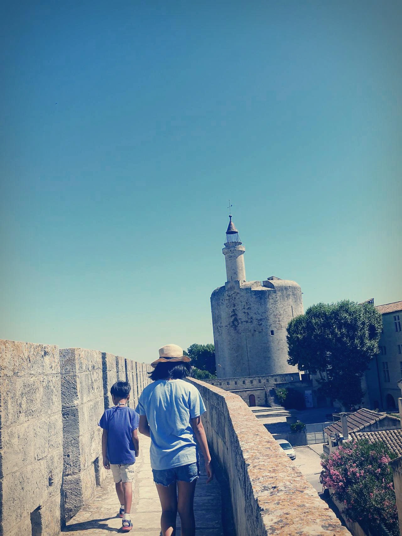 성벽 위를 따라 걷는 관광 코스가 아주 마음에 들었다. 오늘도 어김없이 하늘은 푸르다. 그늘이 될 만한 것은 코너마다 있는 타워들뿐이다. 그래도 아이들은 약 한 시간 정도 걸리는 성벽 위의 산책을 즐거워했다. 성벽 안쪽에는 3~5층 높이의 주택과 상점들이 빼곡히 들어서 있고, 해안가 쪽으로는 멀리 핑크빛 염전이 내려다보인다. 북쪽으로는 수로에 정박한 요트와 보트들이 보인다.