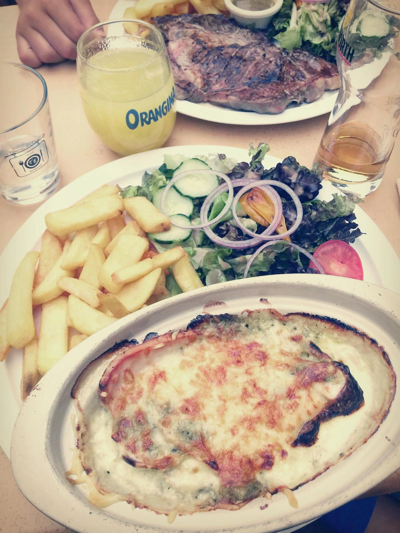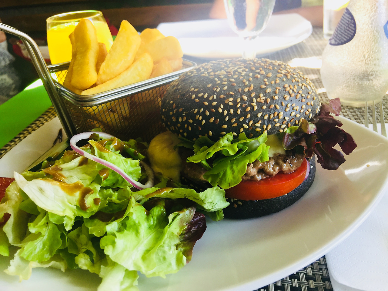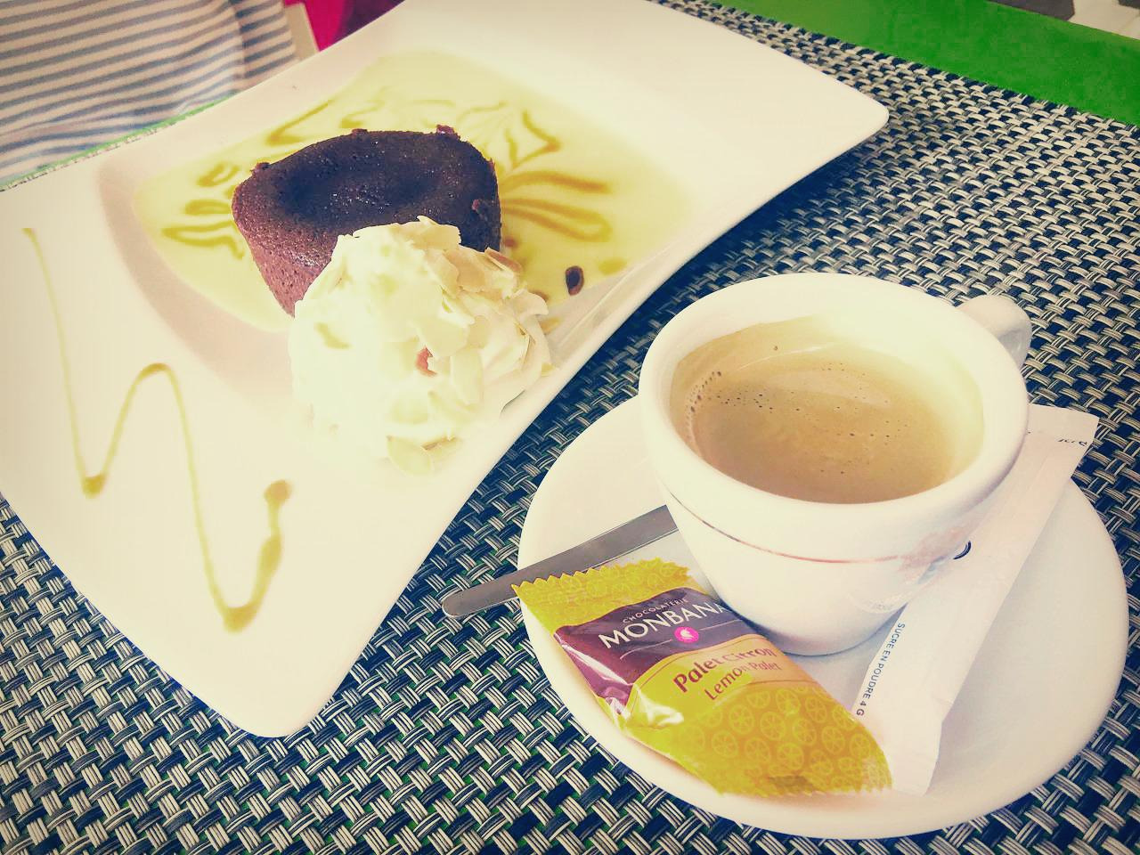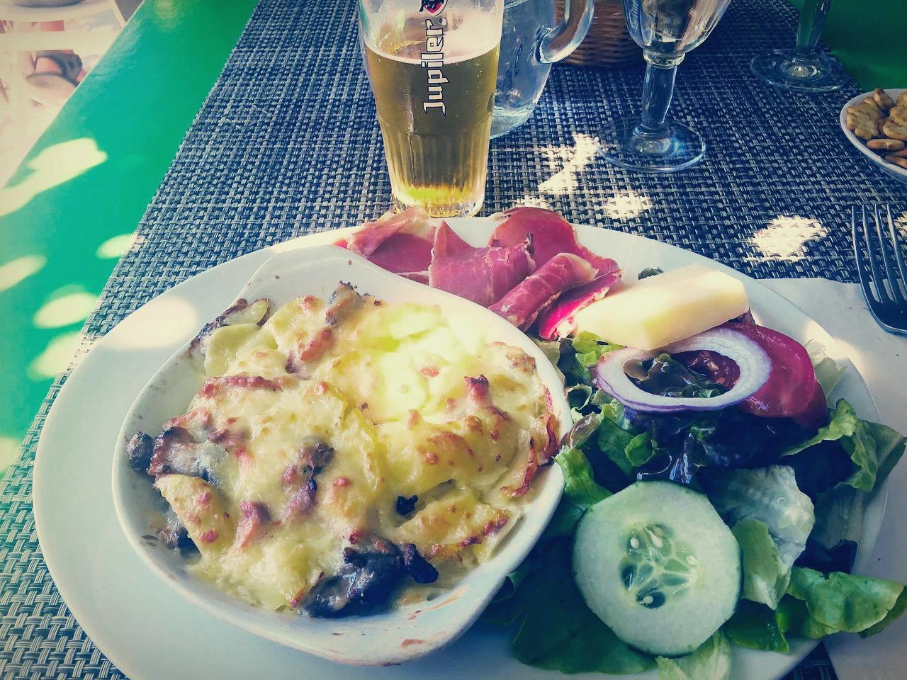 경치가 너무 좋아서 맥주 한잔을 마실 수밖에 없다. 검은 빵에 통깨가 촘촘히 박힌 버거와 통통하고 뜨거운 감자튀김, 감자와 베이컨, 치즈를 오븐에 구운 요리와 햄과 치즈를 곁들인 샐러드를 먹었다. 디저트로 아이들은 쵸코 케이크와 아이스크림을 나는 진한 에스프레소 한잔을 마셨다. 프랑스에 와서 식당에서 먹는 음식은 매번 비슷한 느낌이지만, 작고 외딴 마을임을 감안해도 오늘 점심은 특별히 신선하고 맛이 풍부했다.