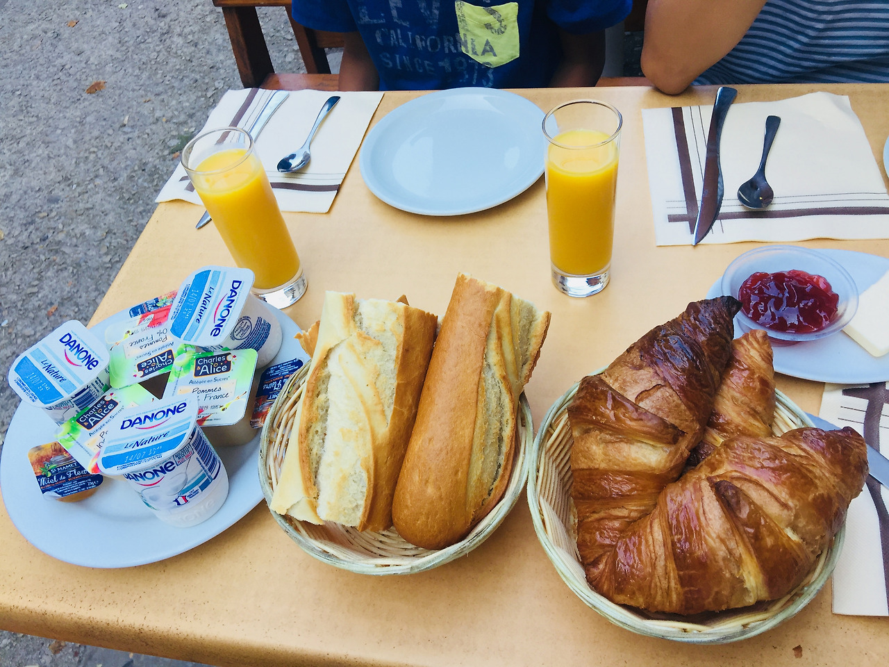 사람 수만큼의 크루아상과 바게트, 버터와 요구르트와 다양한 잼과 오렌지 주스를 차려주었다. 신선한 아침 공기와 바삭한 크루아상을 함께 베어 물었다.