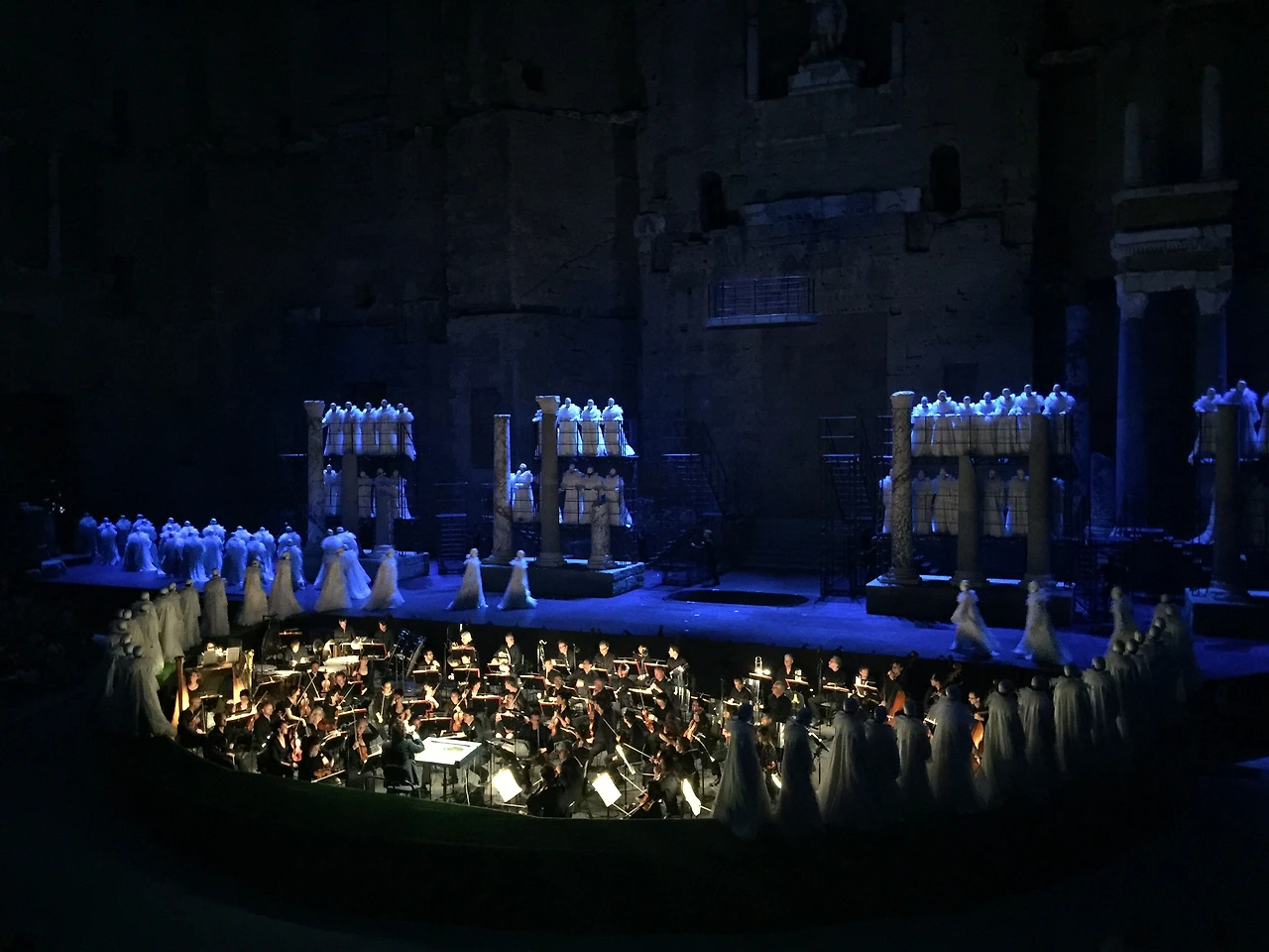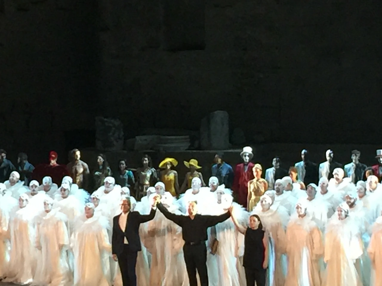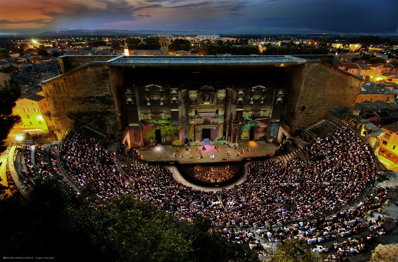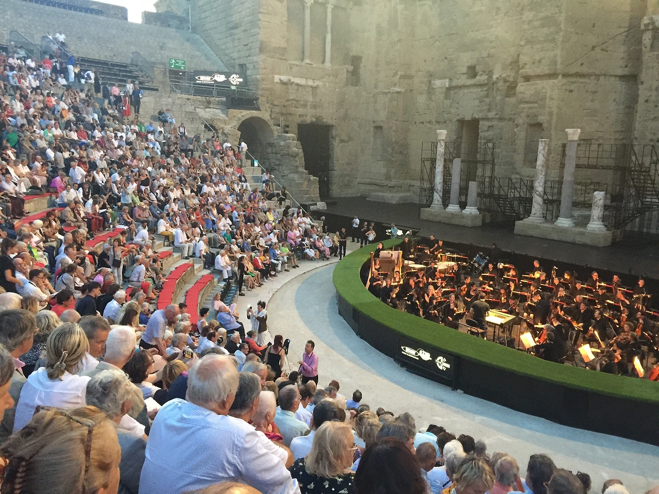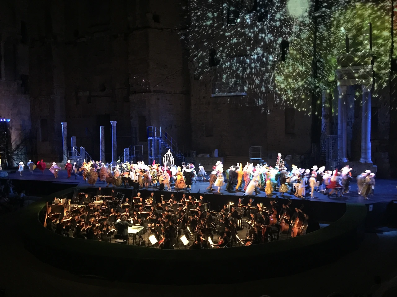 부드러운 7월의 저녁 바람이 고대 야외극장에 불어온다. 10,000명을 수용할 수 있다는 관중석은 이미 만원이다. 대부분이 프랑스 관람객인 것처럼 보이는데, 아마도 가까운 도시는 물론 먼 지방에서도 해마다 열리는 한여름 밤의 이 꿈같은 무대를 보기 위해 일 년을 기다린 사람들이겠지.