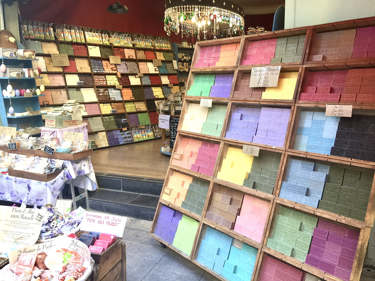저녁때쯤 셋이 다 함께 마세나 광장을 거쳐 쇼핑가를 둘러보고 디저트 가게에서 작은 케이크를 샀다. 형형색색의 비누가 가게 가득 진열되어 있다. 처음에는 저 알록달록한 작은 덩어리들이 뭔지 바로 이해되지 않았다. 원래 올리브 유를 주원료로 하는 고급 천연 비누가 프랑스 남부의 항구도시 마르세유 지역에 생산되는데, 그 명성에 힘입어 프로방스 전역에서 비누를 판매하는 곳을 자주 볼 수 있다.