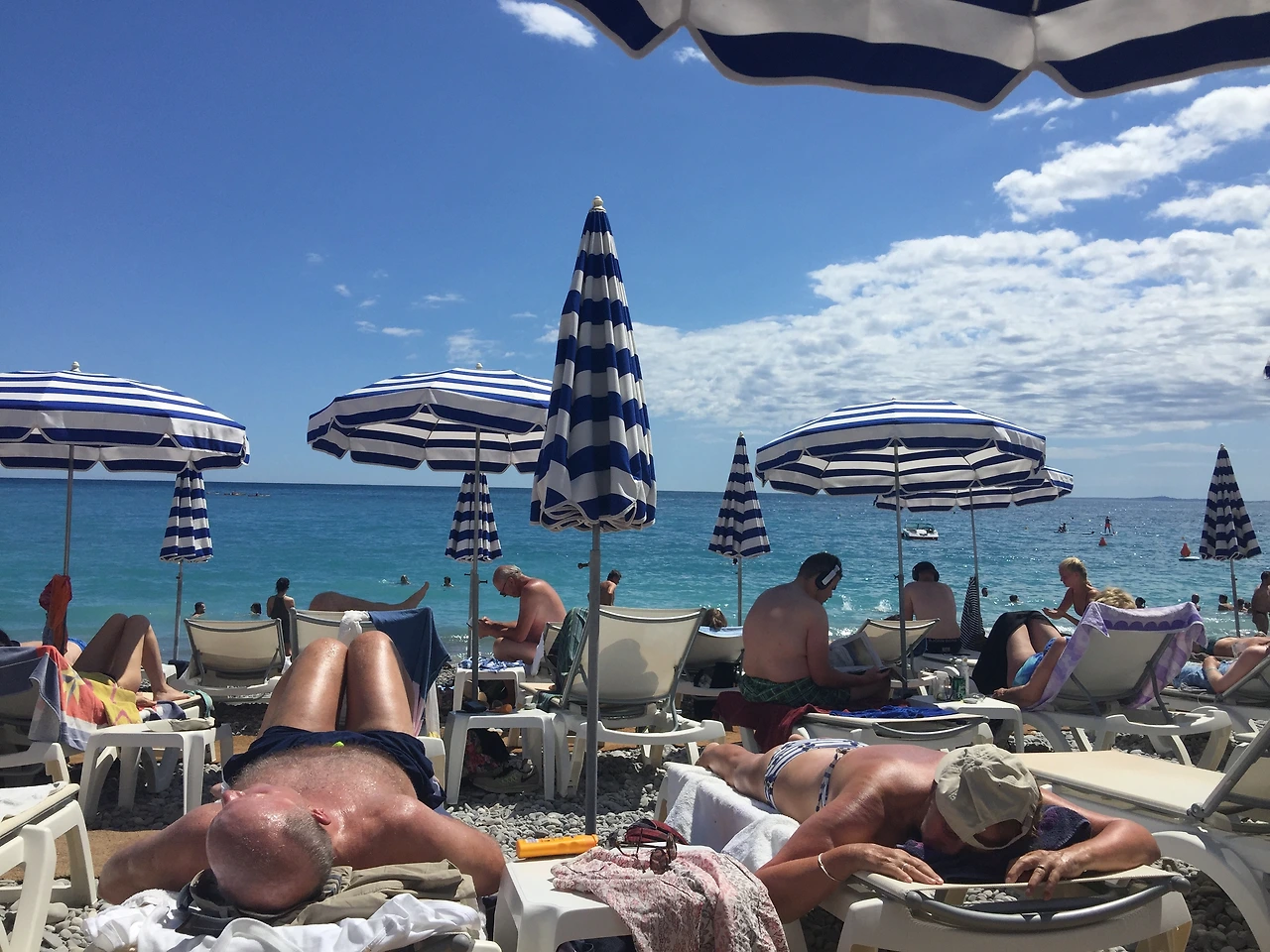 니스 해변에서 가장 해보고 싶은 것은 바로 파라솔 아래 누워 여기 사람들이 하듯이 로제 와인을 마시는 일이다. 바닷가 한 레스토랑에서 운영하는 선베드 두 개를 빌려서 음료수를 마시고 책을 읽었다. 자갈로 이루어진 해변은 뜨겁게 달궈저 있다. 흰색과 남색의 줄무니 파라솔 아래에는 대부분 현지인들로 보이는 백인들이 선탠을 즐기고 있다. 동양인은 우리 외에는 보이지 않아 조금 의식이 되지만, 사실 다른 사람들은 전혀 신경 쓰지 않고 있다. 원래 그렇다. 사람들은 자기 생각하기에도 바쁘기 때문에 내 생각 따위 하지 않는다. 그것만 항상 명심해도 삶은 정말 가벼워지리라. 파라솔 위로 올려다 보이는 푸른 하늘과 비행기 한대가 그림처럼 다가왔다. 더워지면 물속으로 들어갔다 다시 파라솔 아래 그늘에 누워 하늘보다 책을 보다 와인을 한 모금 마신다. 파라솔 위로 작은 비행기 한대가 지나간다.