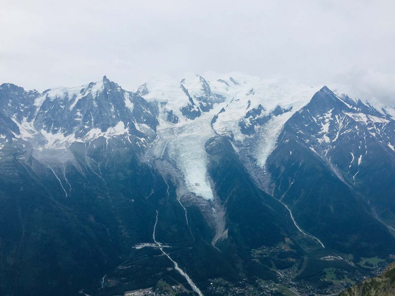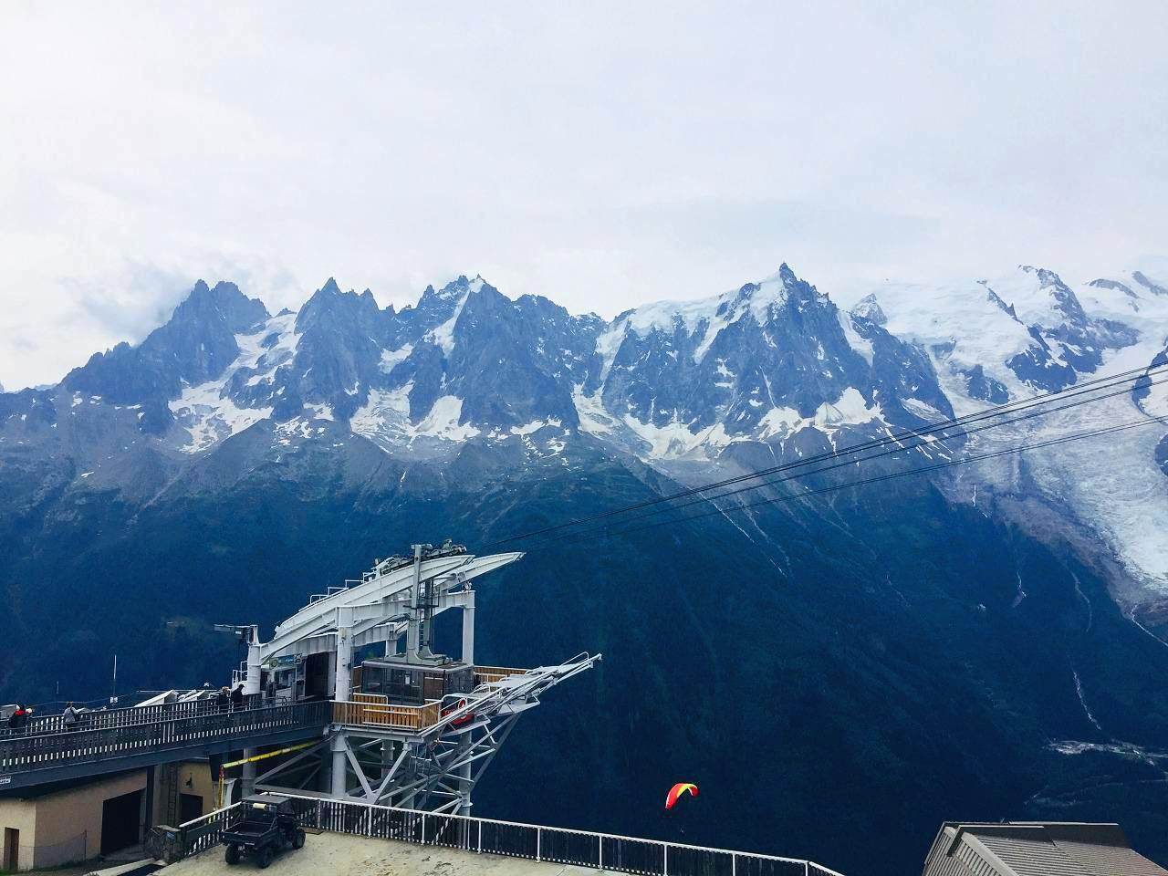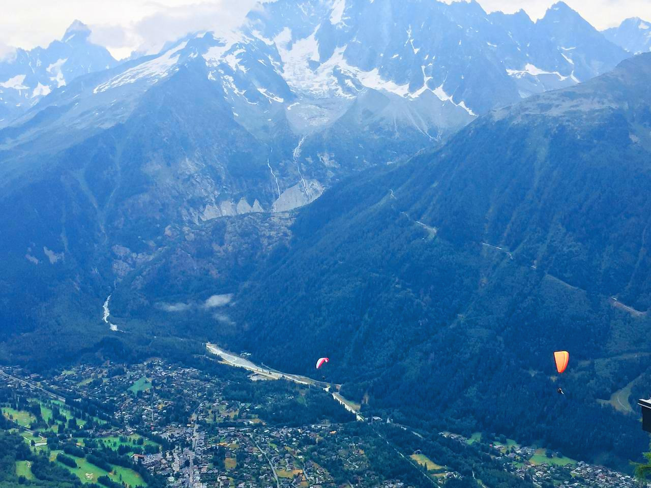 어제 탔던 케이블카보다는 훨씬 덜 무섭다. 정상에 오르니 과연 산과 산 사이의 좁은 평야에 있는 샤모니 마을과 건너편 빙하와 그 위의 몽블랑이 아주 잘 보였다.