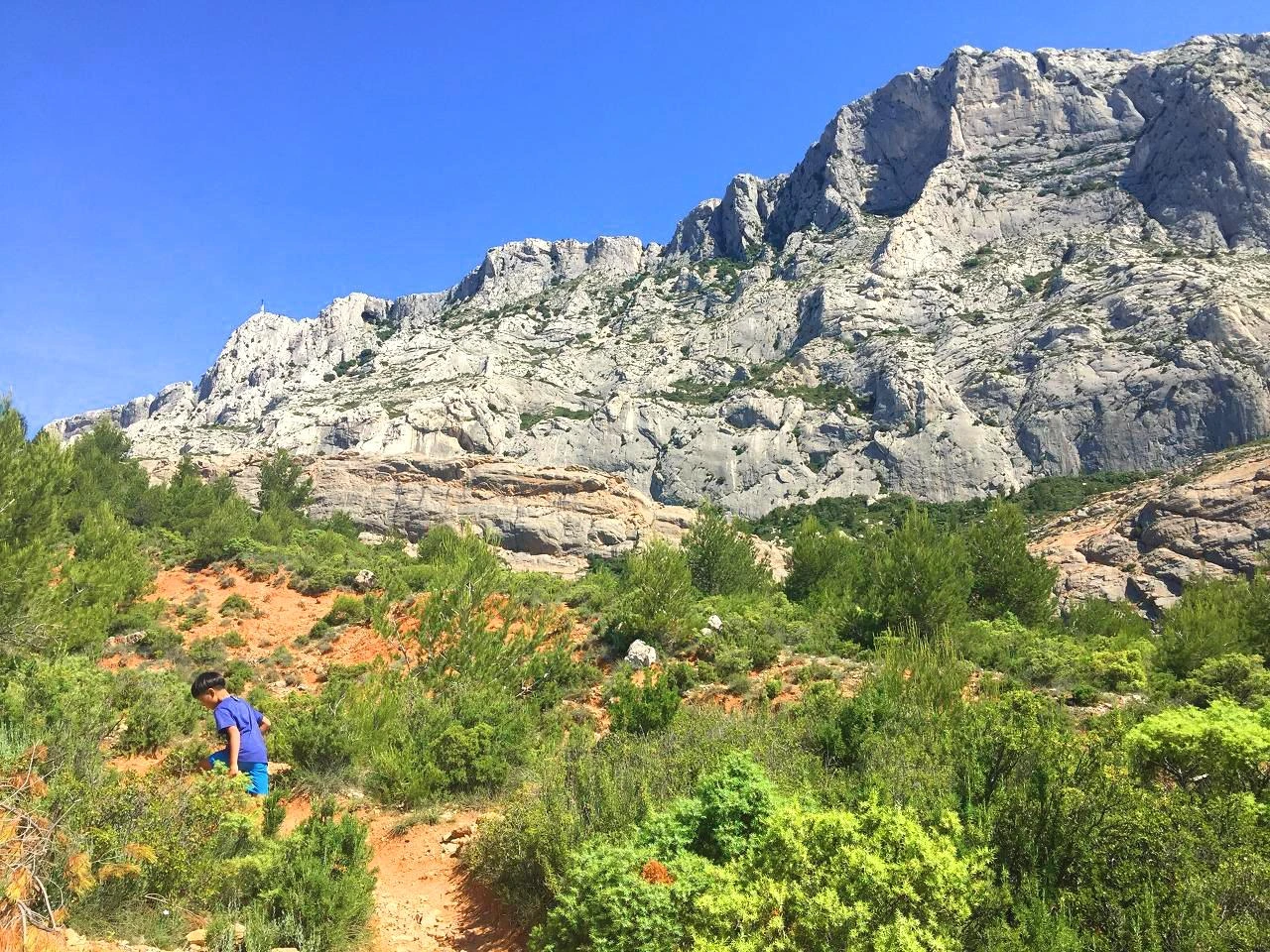 마음 한 구석에서는 불안함이 있었지만, 안내소에서 지도를 받아 짧고 쉬운 코스를 선택하여 호기롭게 트레킹에 나섰다. 폴 세잔의 대피소라고 표시된 지점까지는 가보고 싶었다. 화구를 등에 매고 지팡이를 짚고 올랐을 이 산에서 그의 발자취를 느끼고 싶었다. 폴 세잔이 되어 메마른 산의 구석구석에서 발산하는 신비로운 예술적 영감을 조금이나마 느껴보고 싶었다. 우뚝 솟은 산 덩어리는 은빛으로 빛나고 있다. 하지만 오전 10시에도 이미 6월의 남프랑스의 태양은 존재감을 유감없이 발휘하고 있었다. 그것은 곳곳에 나무와 건물들이 그늘을 만들어내는 마을에서 만난 햇살과 매우 다른 종류의 것이었다. 불과 300미터쯤 올랐을 때 나는 바로 항복했다. 대신 멀리서 산을 우러러보았다. 사막같이 메마른 석회암 바위들과 덤불들과 반짝이는 프로방스의 태양 빛이 아마도 세잔을 이곳으로 끊임없이 불러들였던 것 같다.