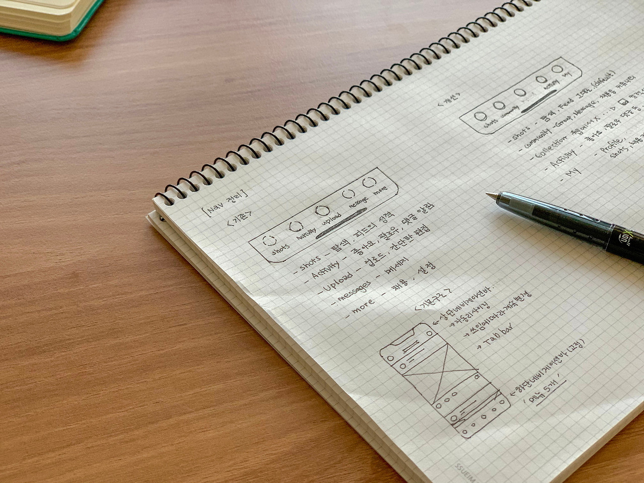 UX 분석을 바탕으로 새로 카테고리를 짜면서 노트를 사용하게되었다. 사실 스케치를 사용하면 더 빨랐겠지만 역시 많은 것을 손으로 그려온 나는 아직 노트에 직접 그리기가 생각하기엔 편하긴 하다. 네비게이션 바를 새로 설계하면서 기능을 분류하는 것에는 고려해야할 것이 정말 많다는 것을 알게 되었다. 꽤 여러 페이지를 쓰고 다시 쓰기를 반복했다.