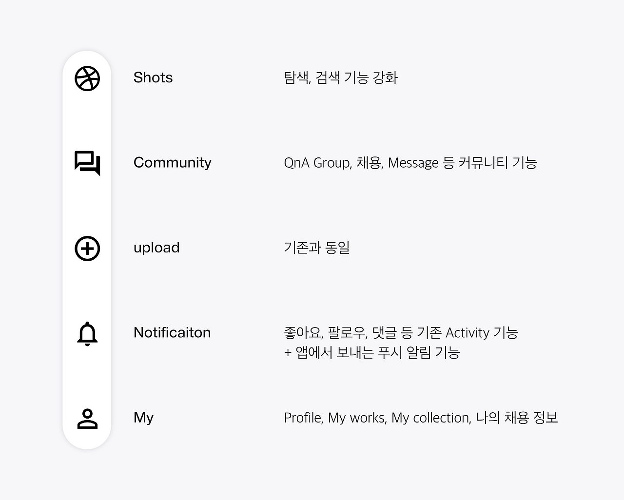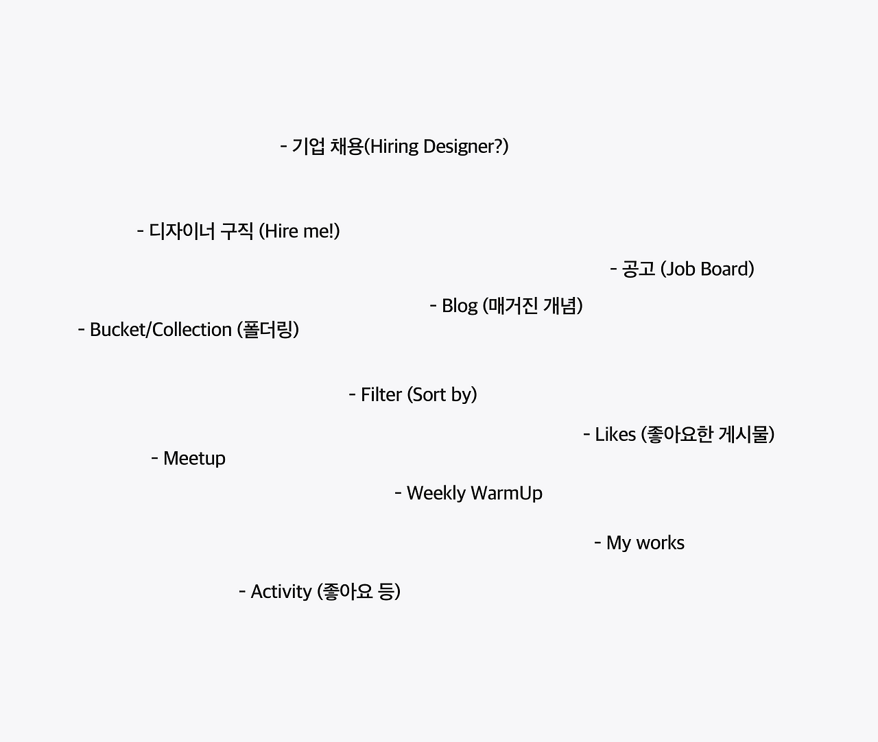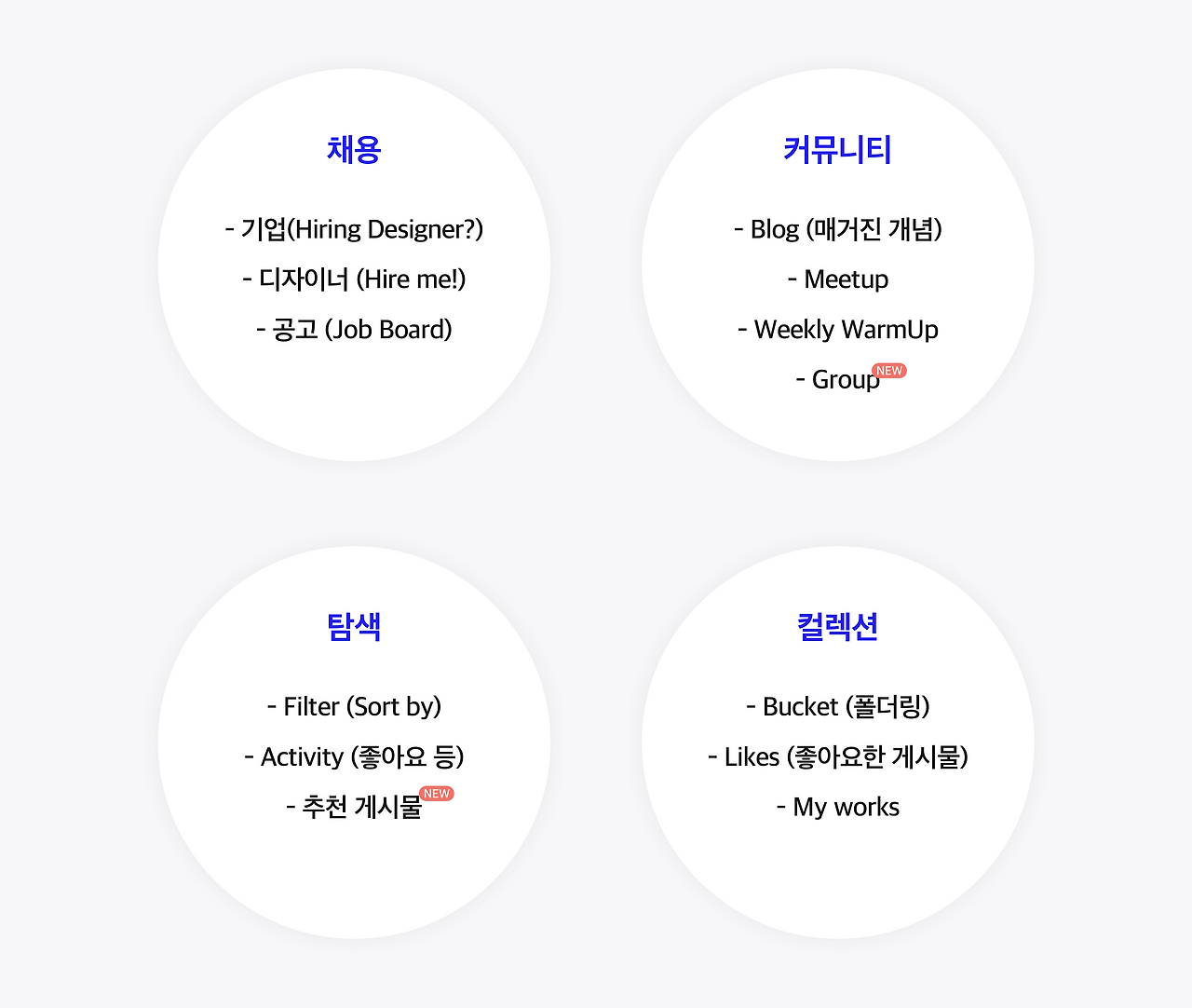 웹에서 꽤나 많은 기능들이 활성화 되어있고 디자이너 입장에서 또 유용했다. 이러한 기능들을 앱에 담기 위해 4가지로 그룹핑(Grouping)을 해보았다. 디자인 공유 기능을 세분화하여 탐색과 컬렉션으로 나누어, 채용, 커뮤니티, 탐색, 컬렉션으로 모아보았다.