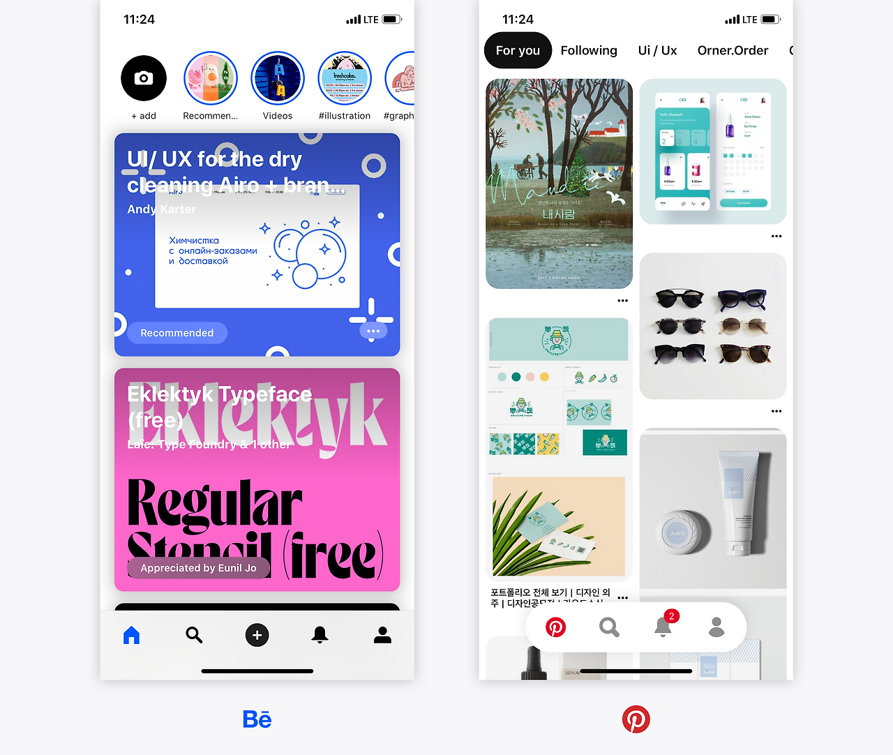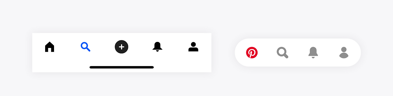 앞서 참고 했던 비핸스와 핀터레스트의 네비게이션 바를 보면 탐색, 검색, 알림, 마이페이지로 구분되어있다. 비핸스는 프로젝트 업로드 기능도 있기는 하나, 아마 많이 사용되진 않고 상징적으로 넣어둔 느낌이다.(데스크탑에서 작업하기 때문에 웹 페이지에서 업로드하는게 절대적으로 유리하기 때문이다.)