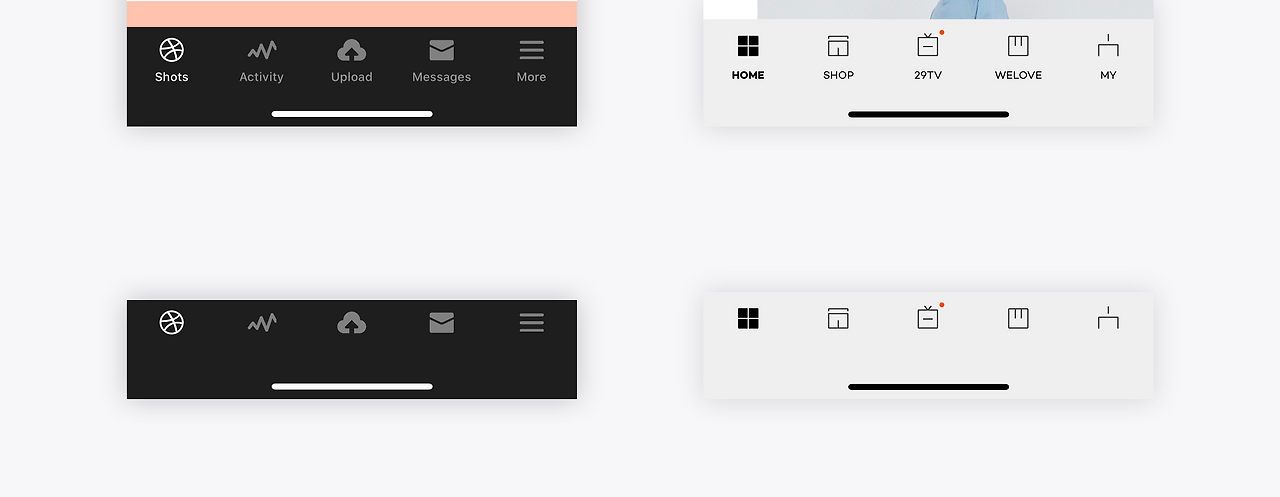 게다가 아이콘도 아쉬운 느낌이다. 비핸스와 핀터레스트와는 달리 아이콘 밑에 텍스트가 아이콘을 설명한다. 텍스트를 없애면 아이콘들이 어떤 것을 의미하는지 애매하기도 하다. 우측은 29CM의 네비게이션 바이다. 드리블과 마찬가지로 부연설명해주는 텍스트 없이 아이콘만으로는 어떤 카테고리인지 알기 힘들다. 브랜드 컨셉에 충실한 것이 아이콘에서는 오히려 상징성을 많이 떨어뜨리는 느낌이다.