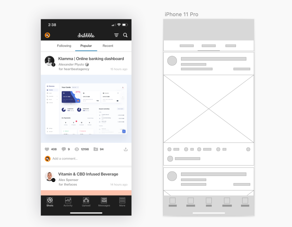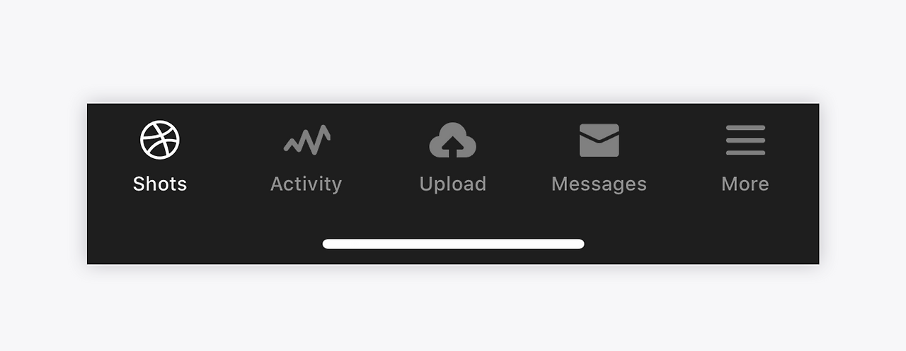 현재 드리블의 네비게이션 바의 구성은 Shots(탐색), Activity(notification), Upload(업로드), Messages(메세지), More(기타) 로 구성되어 있다. 비핸스나 핀터레스트와는 사뭇 다른 구성이다.