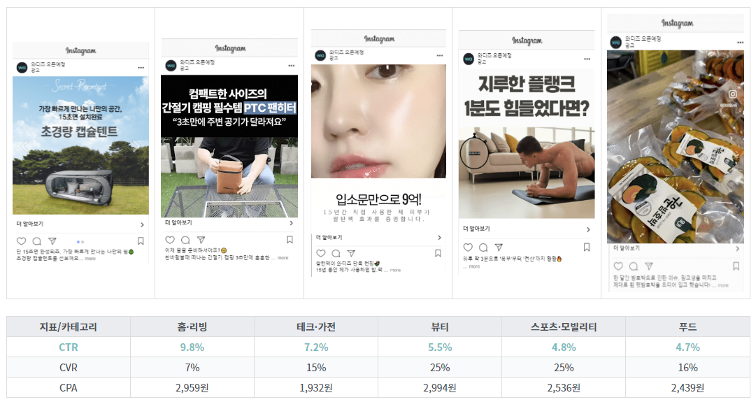 아래 와디즈만 보더라도 광고에 따른 평균 CTR(Click-Through-Rate, 노출 대비 클릭률), CVR(Conversion Rate, 전환율), CPA(Cost-Per-Action, 액션전환비용)를 알려주고 있다.