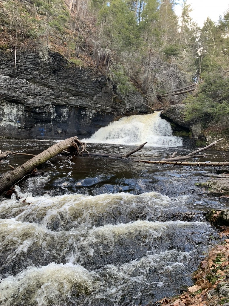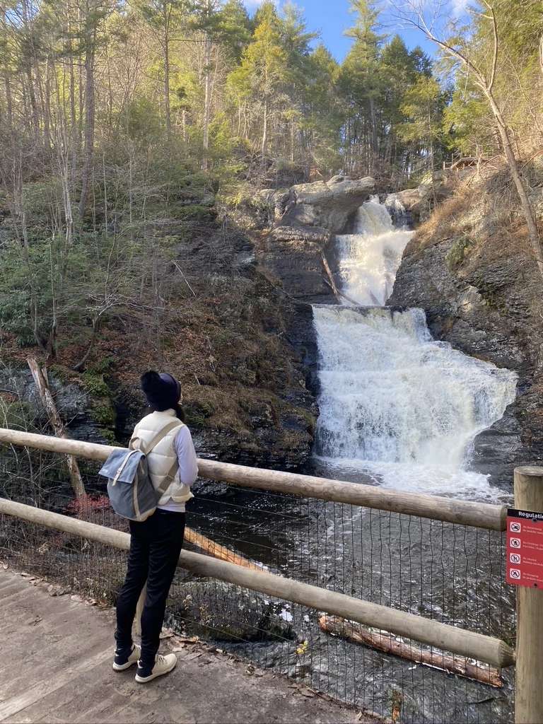 지도 앞에서, 어느 쪽으로 걸어 볼까? 오른쪽으로 가보자. Trail을 따라 걷기 시작했다. 얼마 걷지 않아서 폭포가 나왔다. 펜실베이니아 주에서 가장 높은 3단 폭포라고 한다. 오랜만에 가까이에서 듣는 폭포 소리에 조금 놀랐다. 물이 떨어져서 나는 소리가 생각보다 아주 컸다. 우리가 선택한 오른쪽으로 걸어가기 시작한 길은 폭포 위에서부터 아래로 내려가는 길이었다. 폭포를 따라 옆으로 내려가는 경사가 꽤 가팔랐다. 폭포를 보여주러 아이들과 다시 오고 싶은데, 우리 아가들 이 길을 잘 올라오고 내려올 수 있을까? 폭포를 따라 내려갔다 다시 걸어 올라오는 거리는 약 0.6 km 정도 그리 길지 않았다.