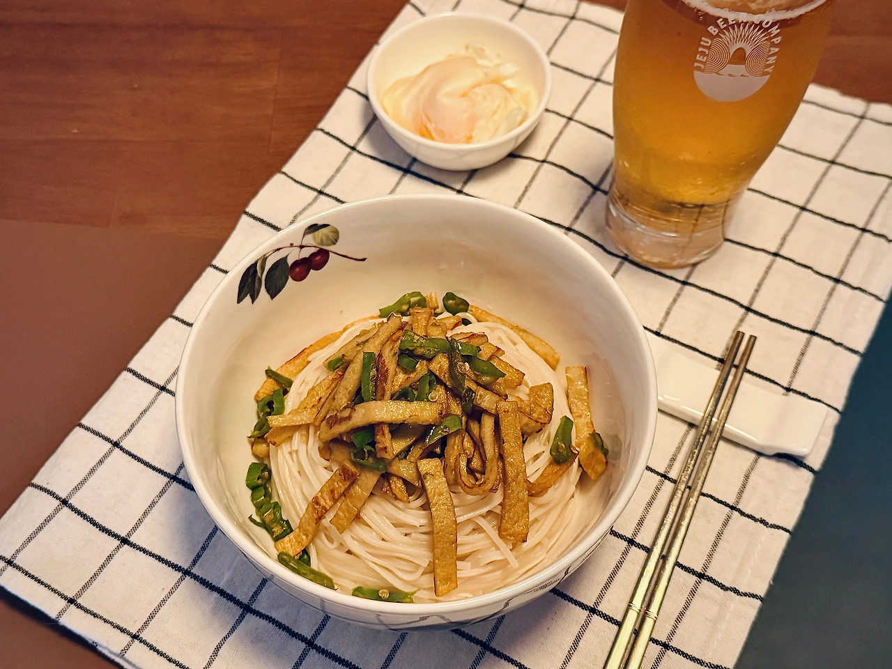 앞선 집밥 살롱은 다 점심이었는데, 이날 처음 저녁 살롱을 열었다. 메뉴는 어묵볶음 얹은 비빔 현미 국수. 첫날의 말차 소바와 둘째 날의 달걀 국수에 이어 세 번째도 국수다. 있는 재료로 조촐한 한 끼 만들어 내는 게 포인트니까, 국수 다 쓸 때까지 계속 면식을 밀어붙일지도.