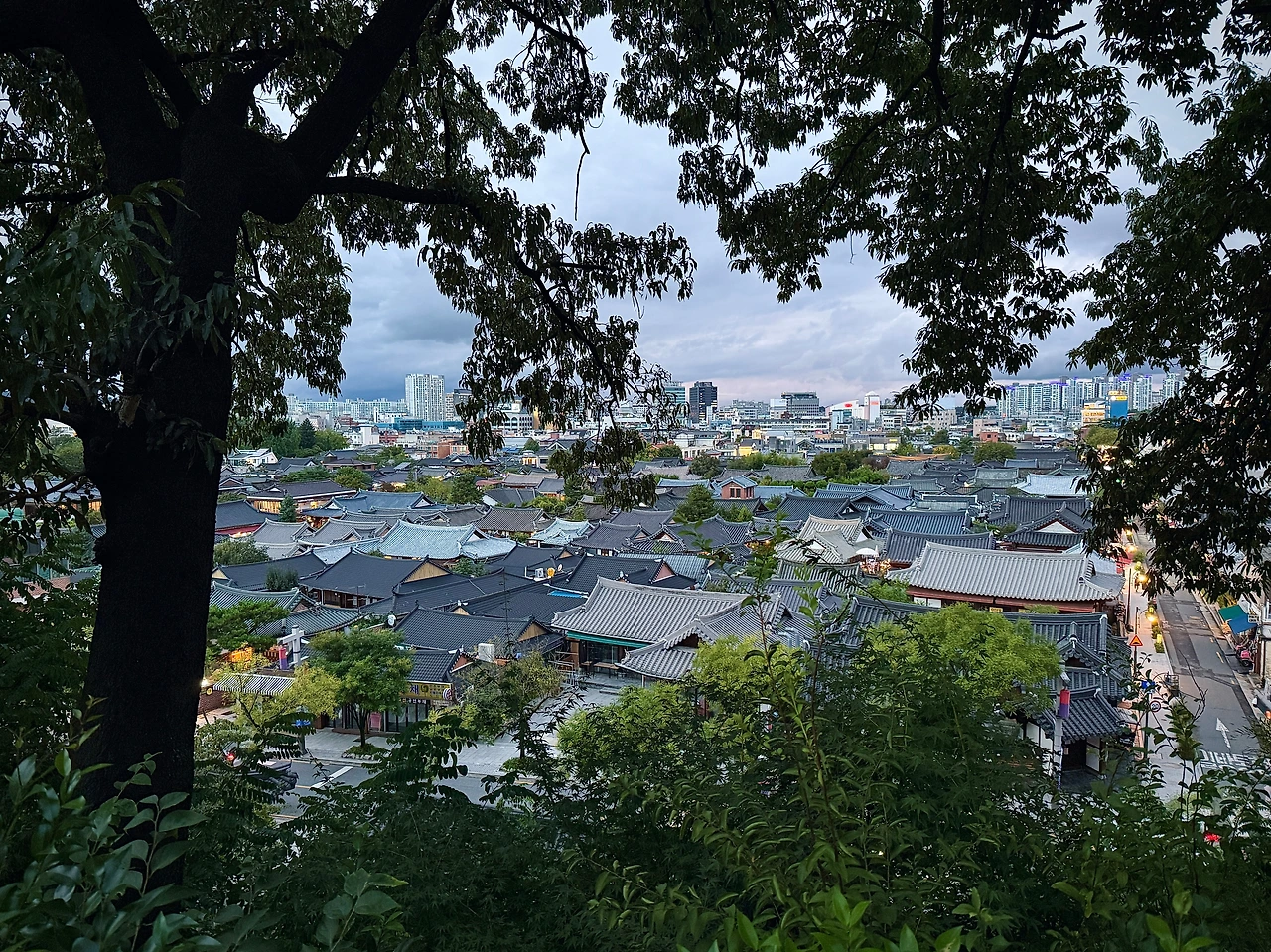 떠나기 전, 한옥에 차린 카페 한 군데를 찾아갔다. 국화차와 디저트를 먹고 떠날 채비를 했다. 못 가 본 곳이 너무 많구나. 차 시간까지 좀 더 보고 싶어 재차 한옥마을을 가로지르고, 가파른 계단을 밟아 오목대에 올랐다. 내려다보니 오밀조밀 모인 듯한 기와지붕들 위로 어스름이 내려앉고 있었다.