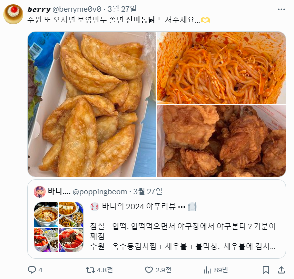 보영만두는 고소한 군만두가 시그니쳐 메뉴로, 겉은 바삭 속은 촉촉해 인기를 끌고 있어요. 야구 팬들 사이에선 만두+쫄면을 시켜 직관할 때 먹는 게 국룰일 정도랍니다. 진미통닭과 함께 인기 많은 곳으로, 웨이팅 줄이 양대산맥을 이룬다고 해요. 위즈파크로 갈 계획이 있으시다면 해당 조합을 추천드립니다.