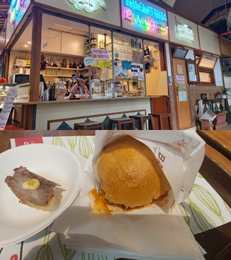 왠지 다음날 아침에도 이 내장버거가 먹고싶어져 다시 시장을 찾았다. 여기는 푸드코트가 아닌 1층 가게로 간단한 스낵바 느낌이다. 북적이는 푸드코트가 부담스럽다면 이런 장소에서 조용히 밥을 먹을 수도 있다. 좀 달달한 레드와인과 내장버거를 시켜놓고 앉아 있는데, 한참 있다 영어를 못하는 주인 할머니가 갑자기 손가락을 입에 대고 '쉿' 하더니 위 사진에 나온 우설 카나페와 튀긴 가지 등을 슬쩍 가져다 줬다. 알고보니 버거를 시킨걸 모르고는, 내가 아침부터 안주도 없이 낮술을 때리는 걸로 오해하신 모양...^^ 조심스럽게 서비스 메뉴를 준건 아마 다른 테이블을 의식해서인듯 하다. 주인 할머니의 따뜻한 배려에 나도 모르게 웃음이 났다.