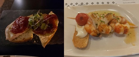 바르셀로나 중심가에 있는 꽤 유명한 타파스 가게가 있었는데 안타깝게도 웨이팅이 너무 길어서 바로 옆 가게에 자리를 잡았다. 빵 위에 염소치즈와 파프리카 잼을 올린 게 왼쪽 메뉴다. 채소로 잼을? 하며 반신반의했으나 입에 넣자마자 의혹은 사라졌다. 파프리카의 톡 쏘는 듯한 맛에 달콤함이 어우러져 생각지 못한 시너지를 낸다. 여기에 녹진한 치즈의 고소함까지...먹다 보면 정신없이 와인을 비우고 있는 자신을 발견하게 된다. 옆에 있는 새우꼬치는 예상 가능한 맛일거라 생각했는데신선한 올리브유와 토마토, 아이올리가 탱탱한 새우살의 감칠맛을 한층 끌어올려 준다.