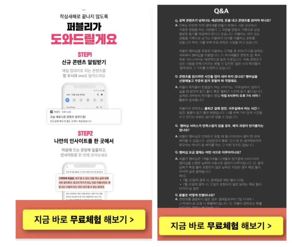 각 STEP 123를 만들어 퍼블리 구독 시 알림과 인사이트를 어떻게 제공하겠다는 안내와 많이 물어보는 Q&A를 만들어 잠재 고객의 궁금증을 해소하고 있다. Q&A 같은 경우는 좀 중요한 질문 내용들이 많아 보였는데 볼드 처리한 거 외에 딱히 눈에 들어오지 않았다.