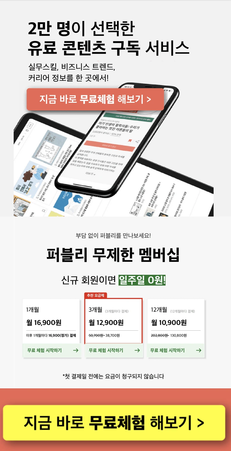 더 알아보기 라는 CTA를 누르면 퍼블리에 대한 내용과 구독 서비스에 대한 요금이 나오는데 아래 하단 전체를 지금 바로 무료체험해보기 CTA를 넣어 무료체험이라는 내용을 아주 잘 보이게 배치해 놓았다. 이 랜딩 페이지의 하단에는 신규 이용 시 금액이 작성되어 기간별 금액이 안내되어 있다.
