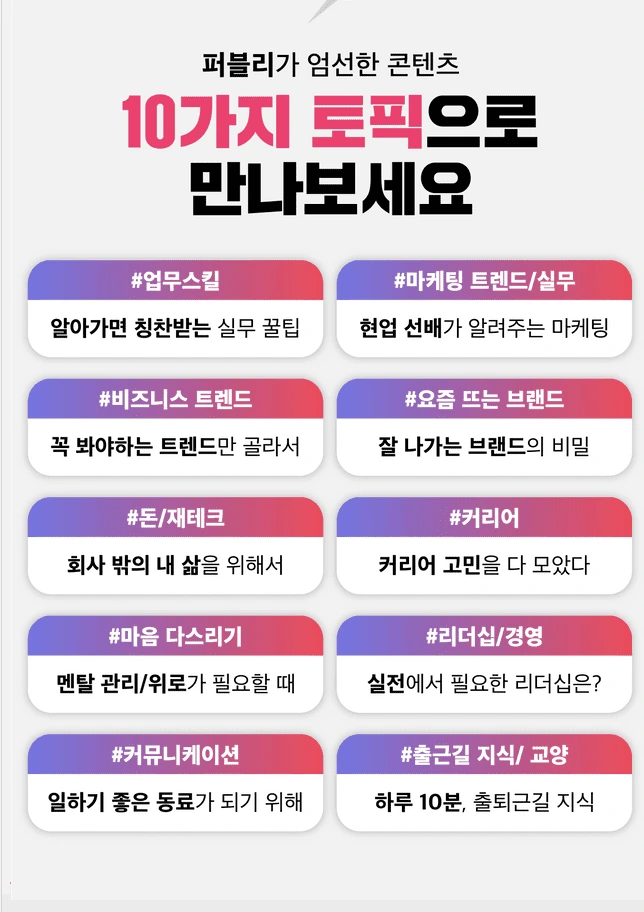가장 대표적인 카피 문구: 퍼블리 하루 10분, 이렇게 활용해 보세요. 이런 분들께 추천합니다.
