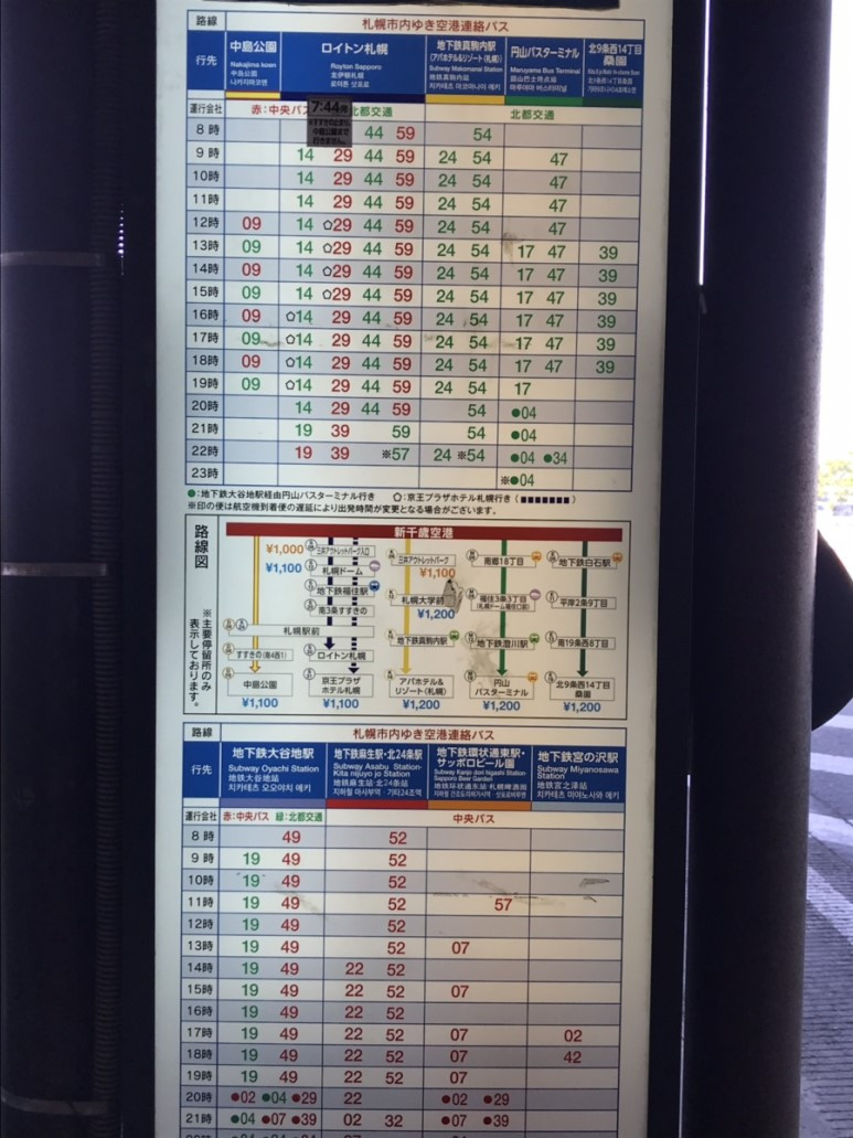 무조건 시내 이동은 리무진버스를 선호하는 편. 길치에 쫄보인 터라 차에 몸과 짐을 맡기고서 걱정 없이 어딘가로 데려다 주는 리무진 버스가 안심이 된다. 공항에서 나오자 마자 도라에몽 왼쪽으로 걸어 1층으로 내려가면 리무진 타는 곳이 나온다. 버스 표를 끊어도 되고, 내릴 때 요금을 직접 내도 되지만 왠지 표를 내고 간단히 내리고 싶어 기계로 스스키노까지 가는 표를 1100엔을 넣고 끊었다. 나카지마 코엔 행을 타기 위해 65번 정류장에서 기다리고 있으면, 나처럼 캐리어를 든 사람들이 잔뜩 줄을 서 있다.