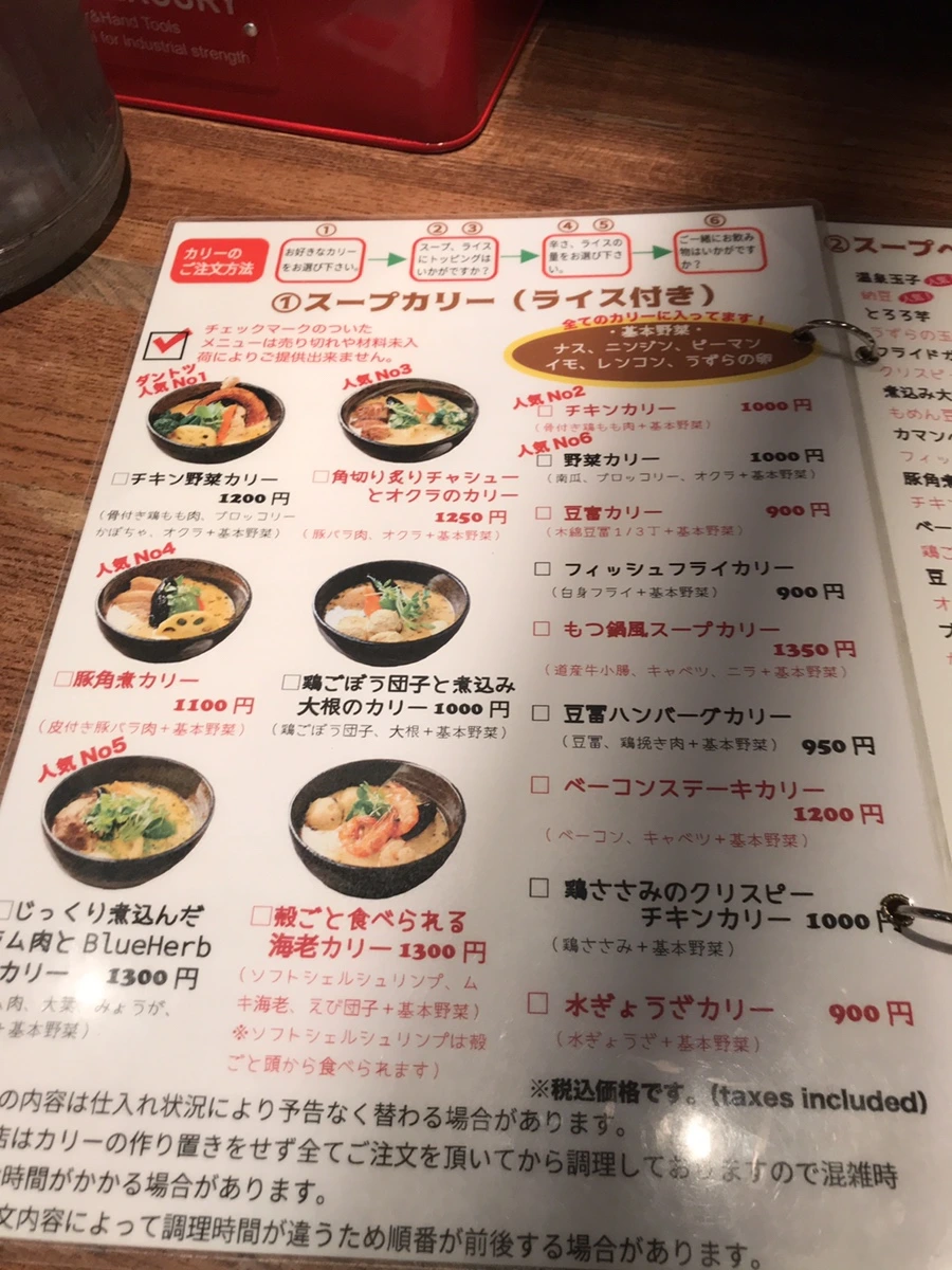 스프 커리 옐로우의 메뉴판. 커리의 종류를 정하고 밥의 양과 맵기를 결정하고 토핑을 정하는 - 어느 스프 커리집과 다름이 없는 시스템.