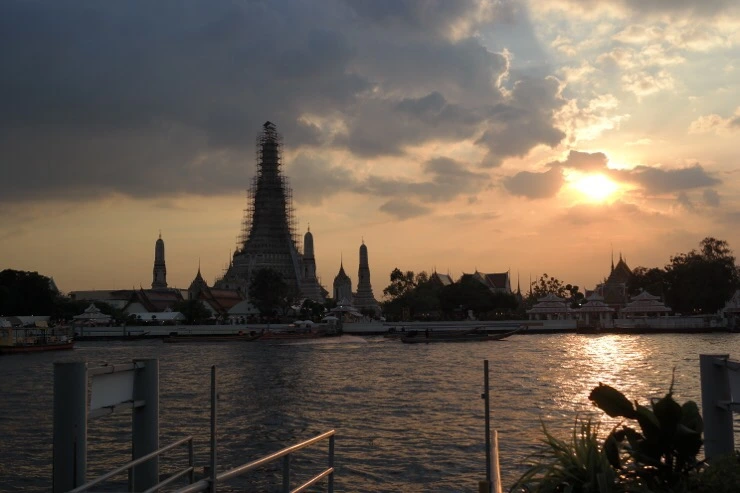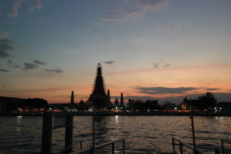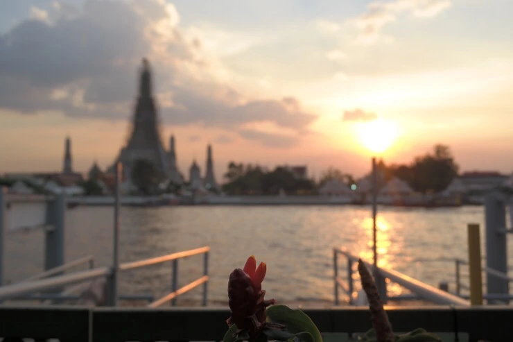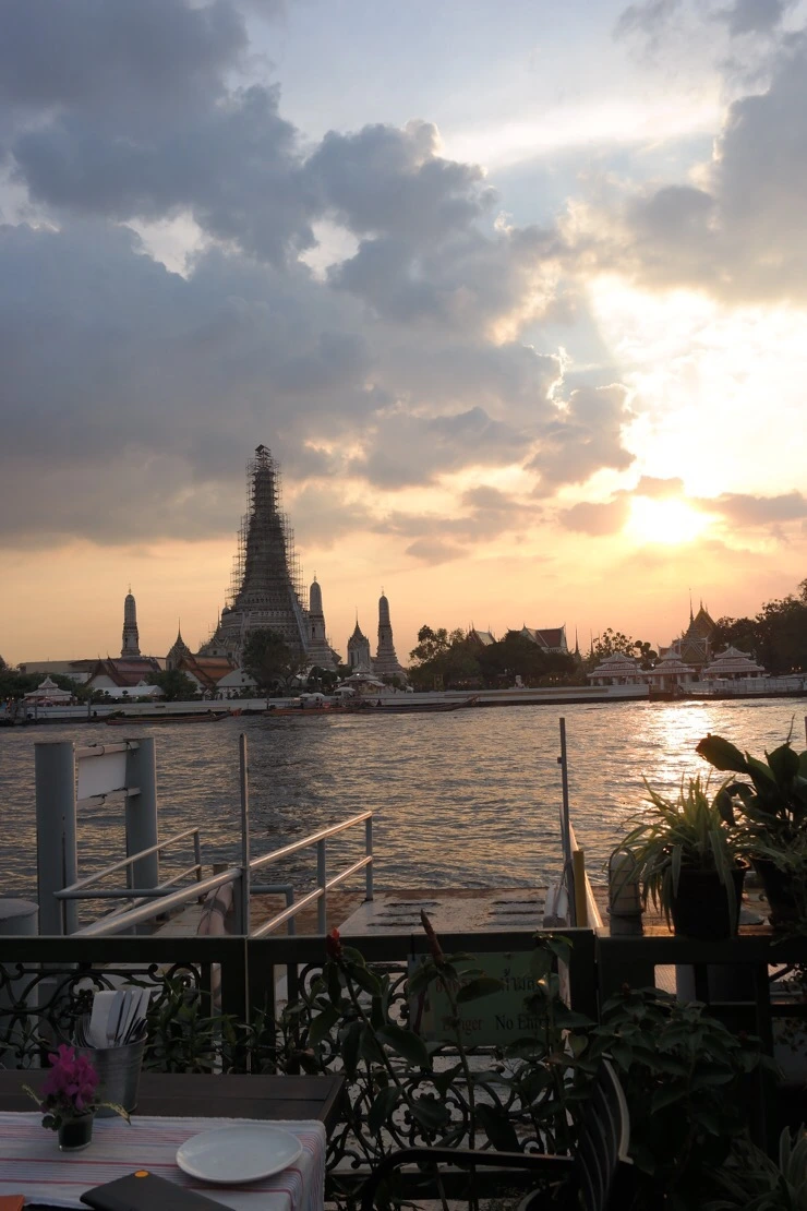 식사를 주문하고 기다리는 동안, 점점 하늘빛이 붉게 물들었다. 넓게 놓여진 테이블마다 적당한 크기의 목소리로 이야기를 나누며 식사를 하거나 칵테일을 마시는 사람들. 간간히 오고가는 짜오프라야 강 위의 수상택시와 보트들. 살랑거리는 바람까지, 하나 하나 모두 다 평화로운 장면의 조각들 - 공사중인 왓아룬은 왠지 바르셀로나의 사그라다 파밀리아 성당이 떠오르기도 했다.